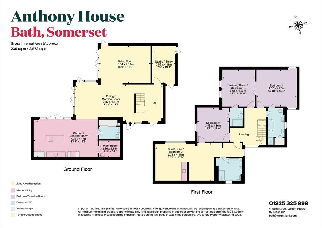 The staircase from the hall leads to a generous upstairs landing. The simple arrangement of rooms from the landing allows for maximum flexibility as bedrooms flow from one to another. Spaces can be opened up or separated as family needs arise, or guests come and go. The principal bedroom and the guest suite both have en suite bathrooms, each with a bath and shower. Bedrooms three and four share an en suite shower room. The guest suite comprises an entrance area, bathroom, bedroom area and a sitting area with kitchenette. This room has a large picture window overlooking the courtyard garden to the Bath skyline beyond.