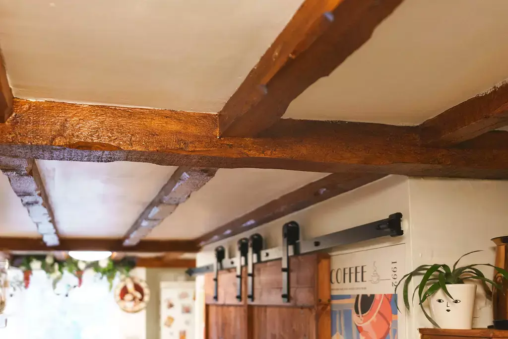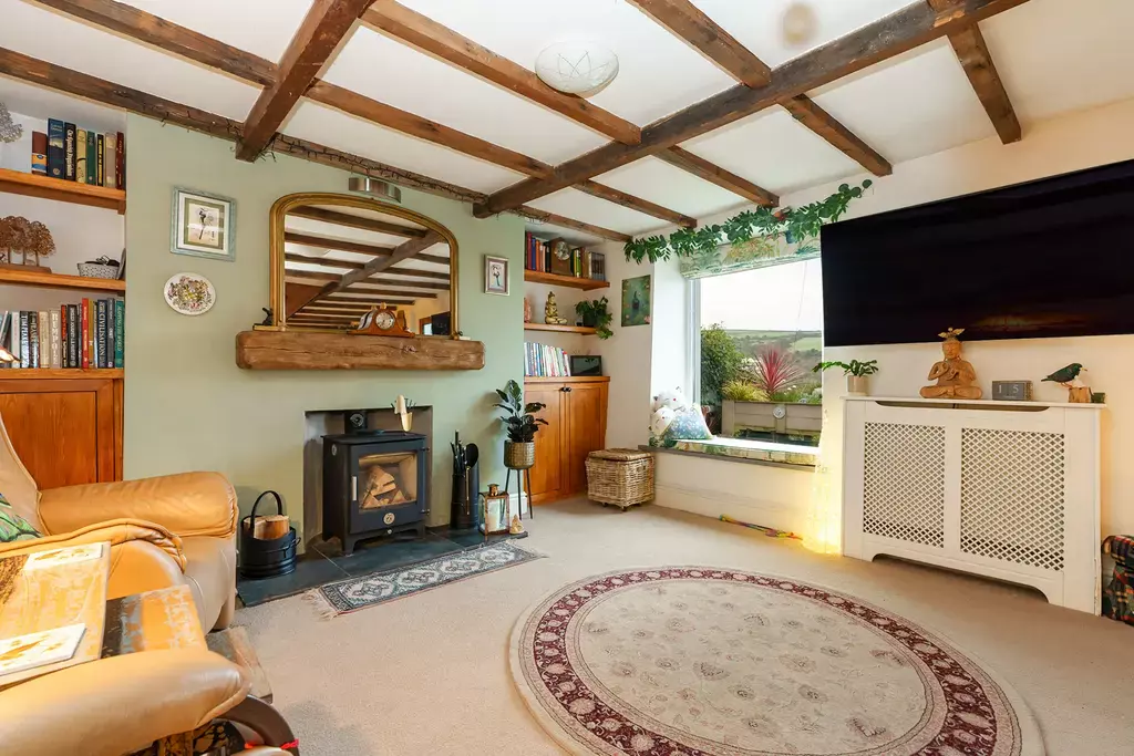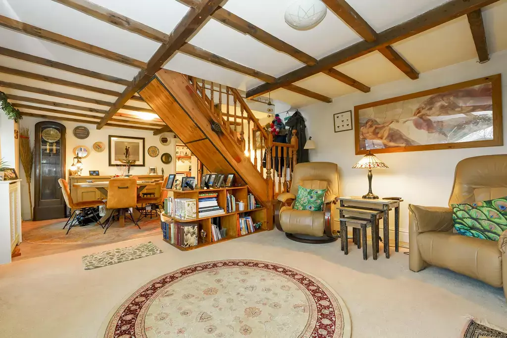 - Charming 25ft living dining room with characterful beamed ceiling, custom window seats enjoying the delightful aspects and a newly installed log burner fitted by the Snug of Ramsey