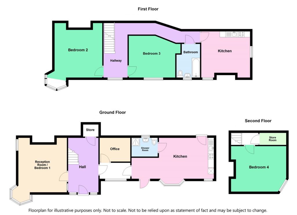 The property is set over three floors. The layout includes an entrance hallway, a reception room currently being utilised as a bedroom, an office, a shower room, and a kitchen on the ground floor. On the first floor, you’ll find two bedrooms, a bathroom, and another kitchen, while the second floor offers a fourth bedroom and a handy storage room.