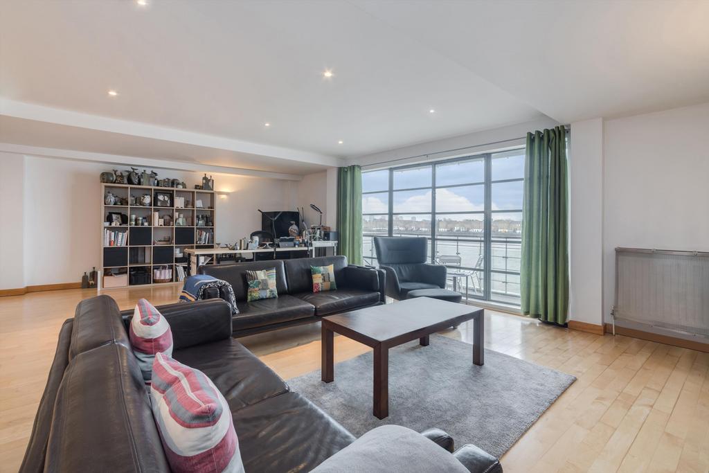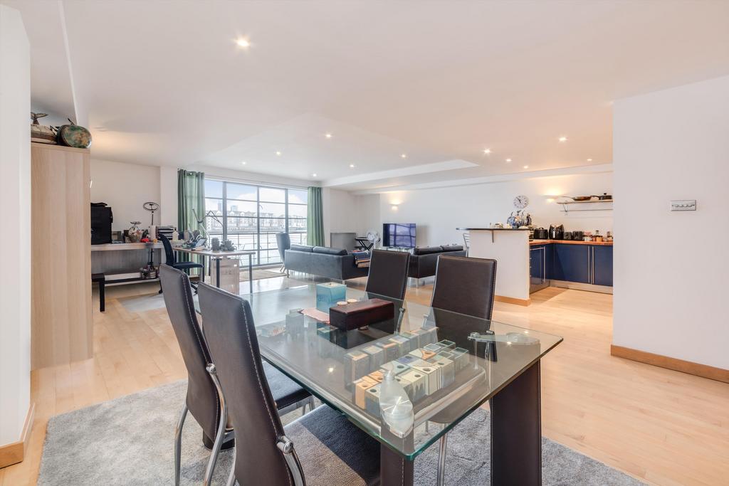 Step into this stunning riverside residence, where the charm of warehouse living meets contemporary elegance. The heart of the home is a vast open-plan reception area, bathed in natural light through expansive floor-to-ceiling warehouse-style windows. This inviting space flows seamlessly onto a south-facing terrace, offering breath-taking views of the Thames and Canary Wharf – a scene that’s truly magical at sunset.