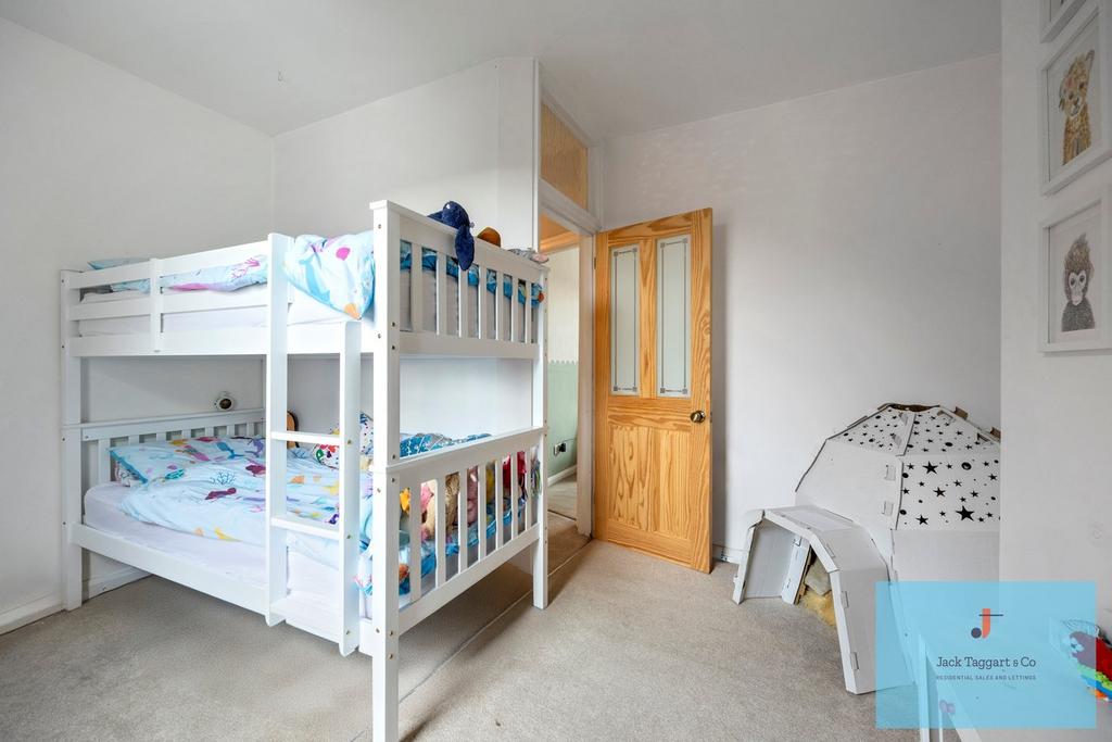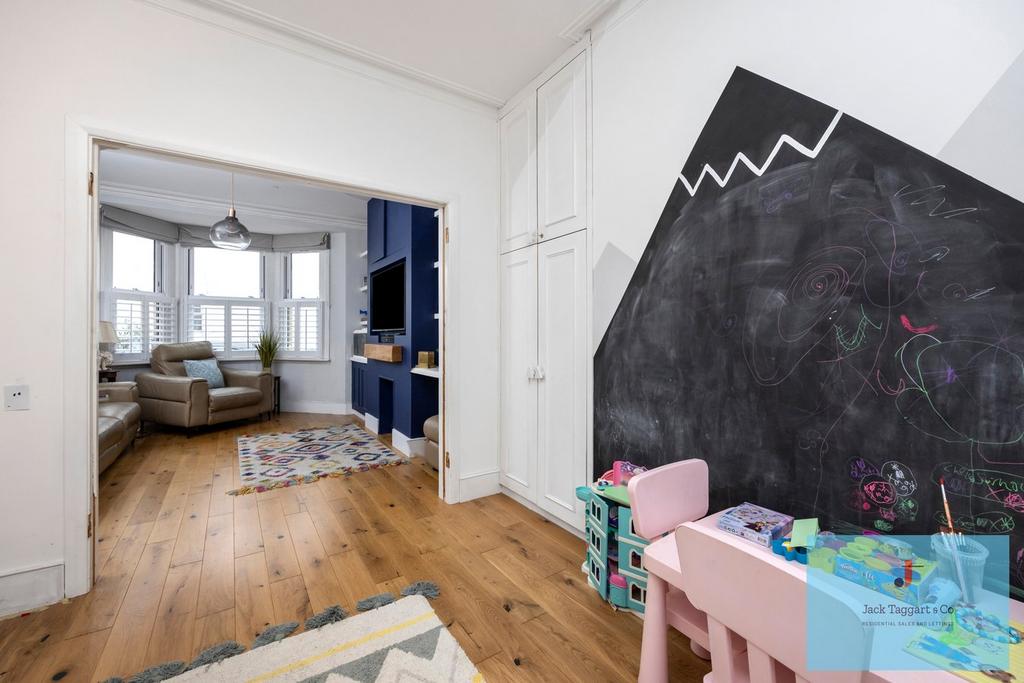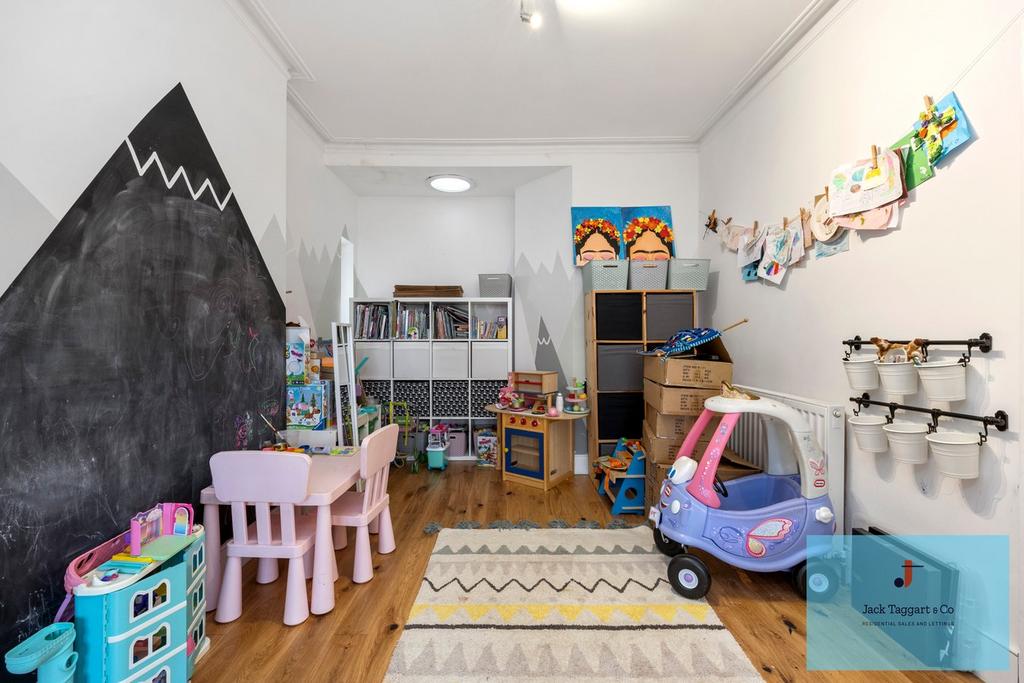 Upon entering through the front door, you’re welcomed by a bright and spacious entrance hall that provides access to all main areas of the home. The front-facing sitting room exudes elegance with its east-facing, double-glazed sash bay window, fitted with stylish wooden shutters. This space is bathed in natural light, creating a warm and inviting atmosphere, and it seamlessly transitions into the adjacent dining area or playroom—offering versatility to suit your family’s needs.