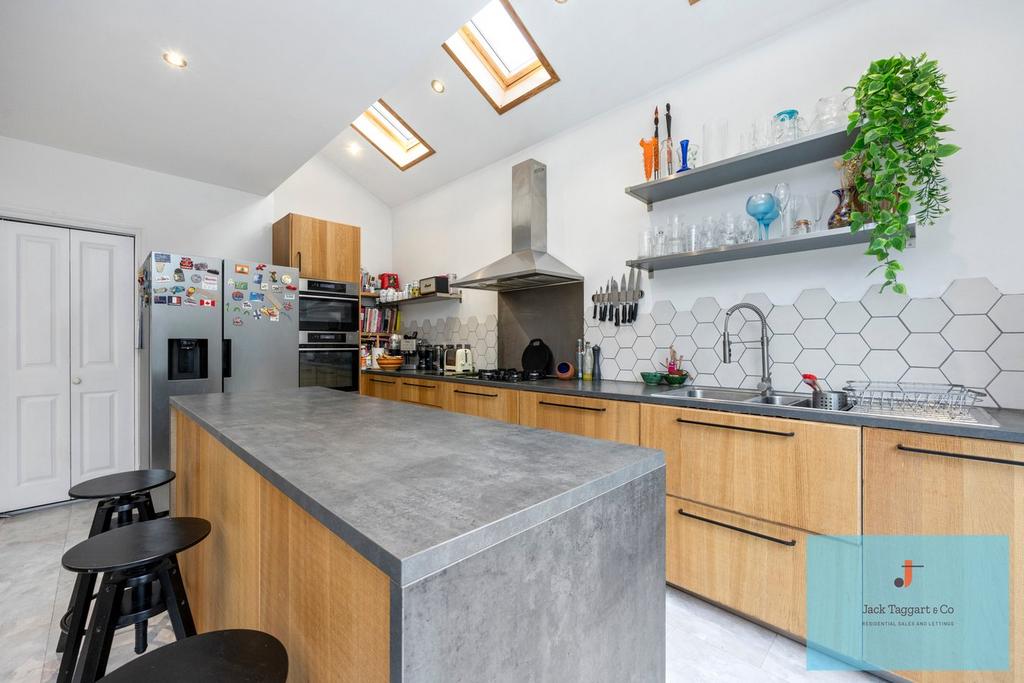 The heart of the home lies at the rear: a spectacular extended kitchen and breakfast room. This modern addition features skylights that flood the space with sunlight and nearly wall-to-wall double-glazed doors that open onto the west-facing garden. The bespoke kitchen is a cook’s dream, offering ample storage, expansive countertops, and a layout that encourages socializing while preparing meals. Whether hosting dinner parties or enjoying casual family gatherings, this space is perfectly designed for both. Completing the ground floor is a conveniently located under-stairs WC, adding to the home’s practicality.