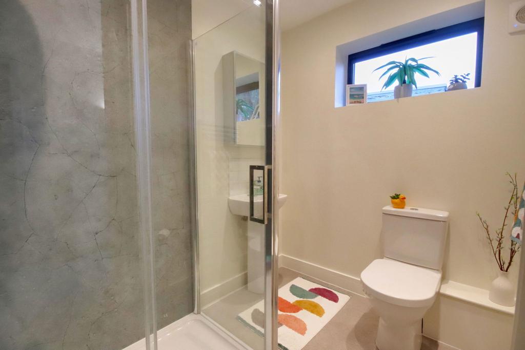 Double glazed window with obscure adhesive coat to the rear aspect, recessed spot lights, extractor fan, chrome towel radiator, partial vinyl wall boards, touch sensitive mirror, shaving socket and underfloor heating with luxury vinyl flooring. There is a three piece suite comprising of a double shower cubicle with sliding doors and a mixer shower over, pedestal wash hand basin and a low level WC.