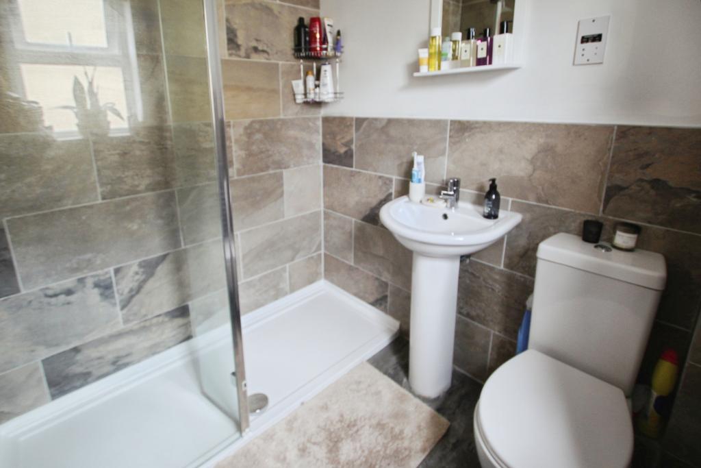 Double shower with glass shower screen and tiled surround, low flush WC, hand wash basin, towel radiator and double glazed window.