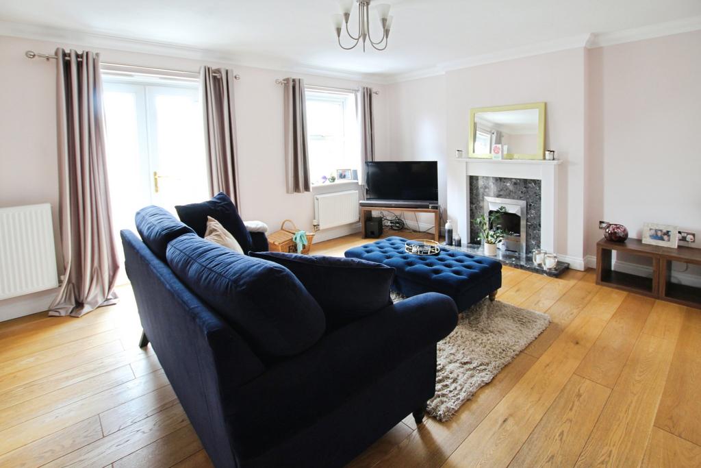 Stylish living room with fire surround, hearth and gas fire, wooden flooring, access through the French doors onto an external decked balcony, double glazed window and radiators.