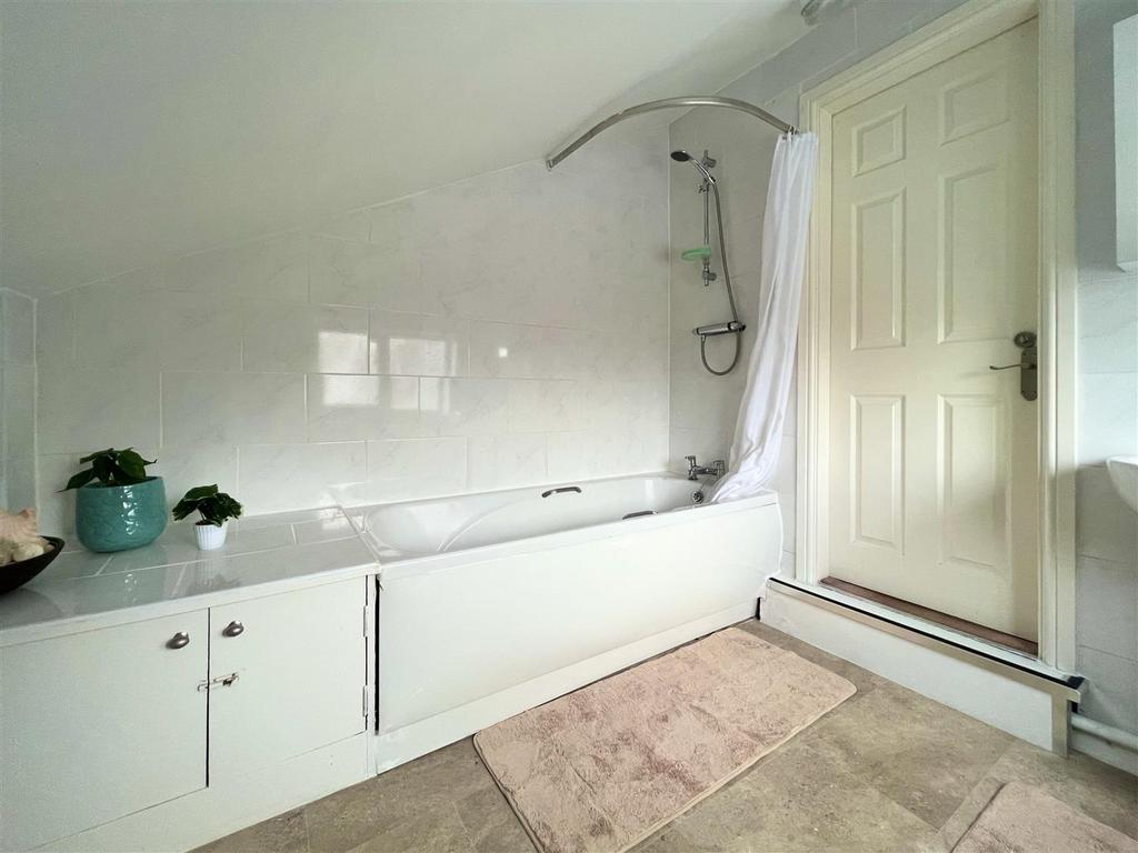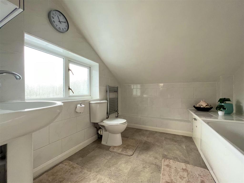 Bathroom - With obscured double glazing window to side, chrome heated towel rail and tiling to walls. Pedestal sink, w.c. and fitted bath with shower overhead.