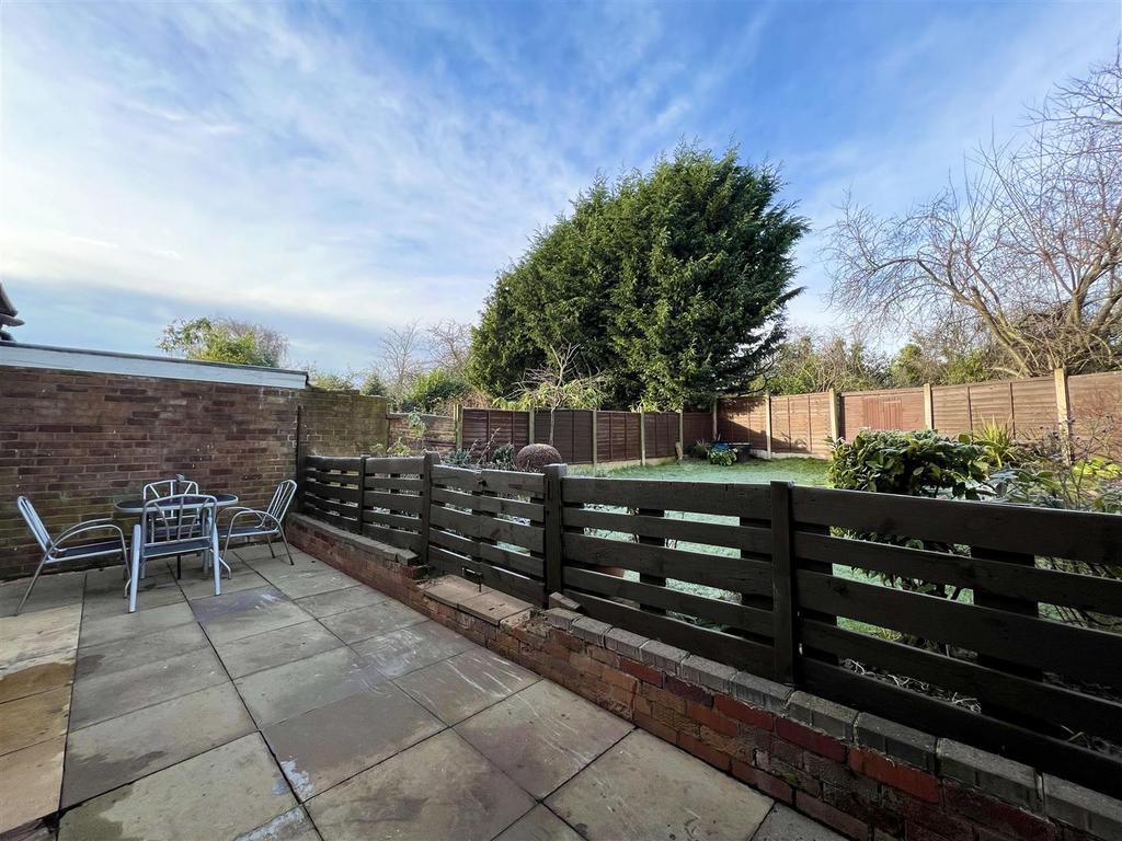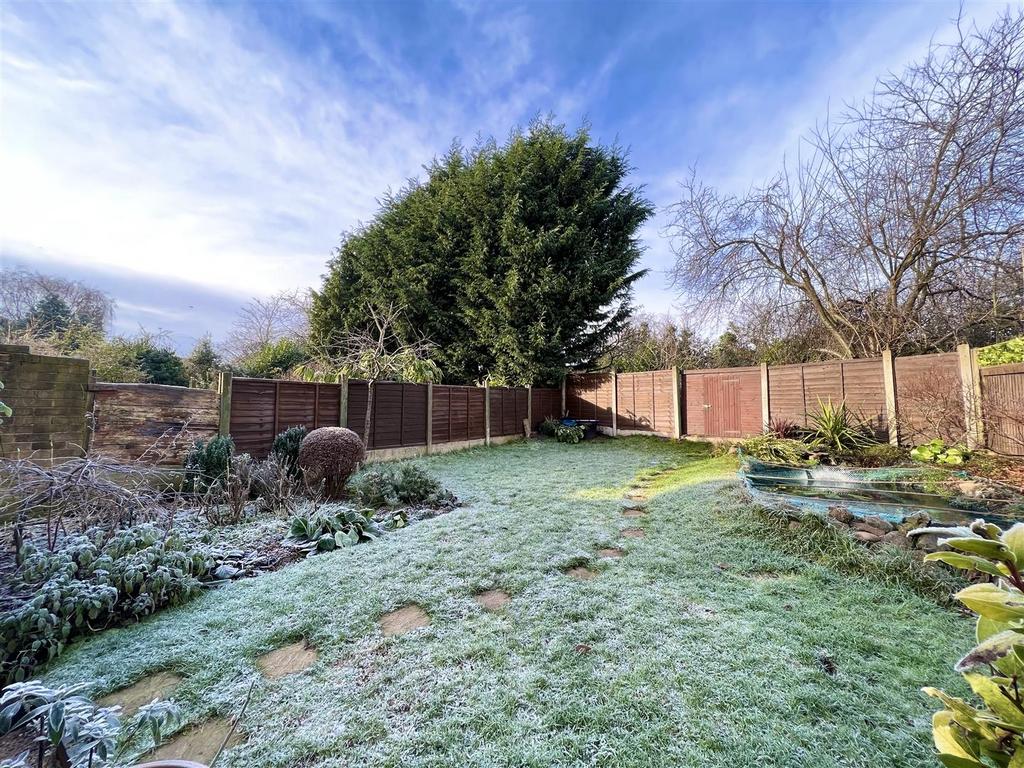 Garden - With patio area, fence with gate and step up to lawn with fish pond and beds with mature plants. Established borders with fencing panels and shed to rear for storage.