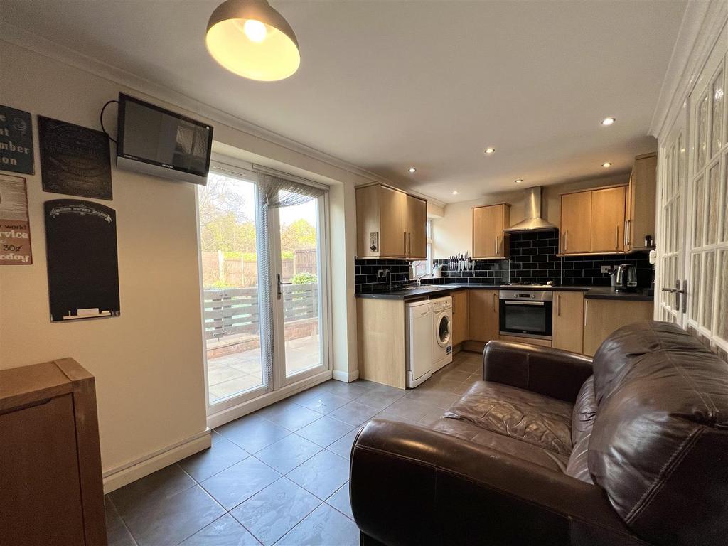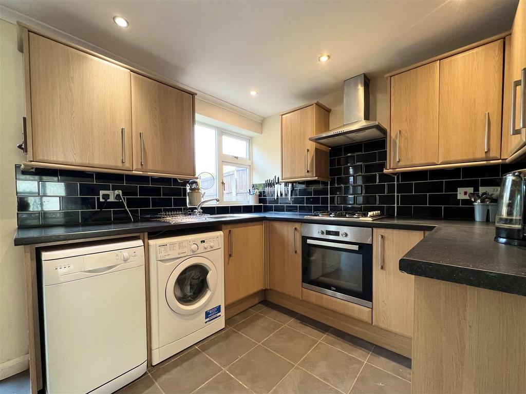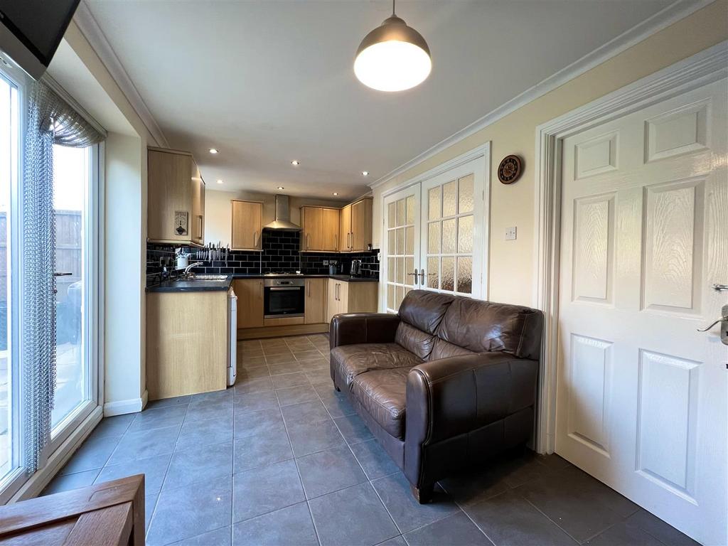 Kitchen - 2.39 x 6.11 (7'10" x 20'0") - With double glazing window looking out on to rear garden and French doors leading out to the garden, central heating radiator and tiling to floor. Various fitted wall and base units worksurface over, stainless steel sink with drainage, integrated Beko cooker and four ring gas hob with extractor fan overhead. There is also space and plumbing for white goods such as a dishwasher and washer machine, along with ample space for a large American style fridge freezer. Further doorway giving access to garage.