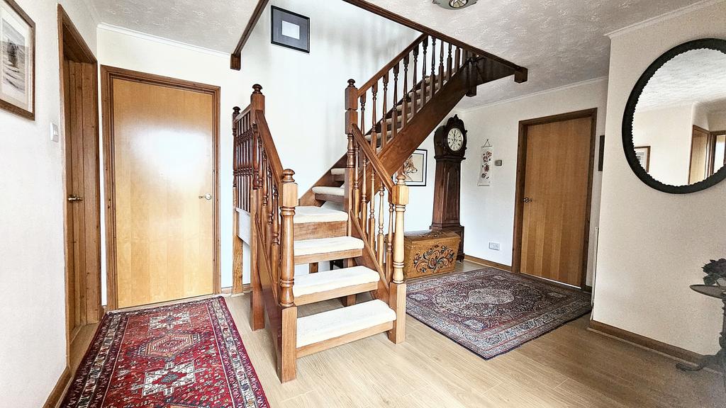 RECEPTION HALL with wood effect laminate flooring, ceiling coving, two radiators, telephone point, four power points, wall light fitting, double recessed cloaks cupboard, and the attractive balustrade with open tread staircase and fitted carpet ascending to the first floor galleried landing.