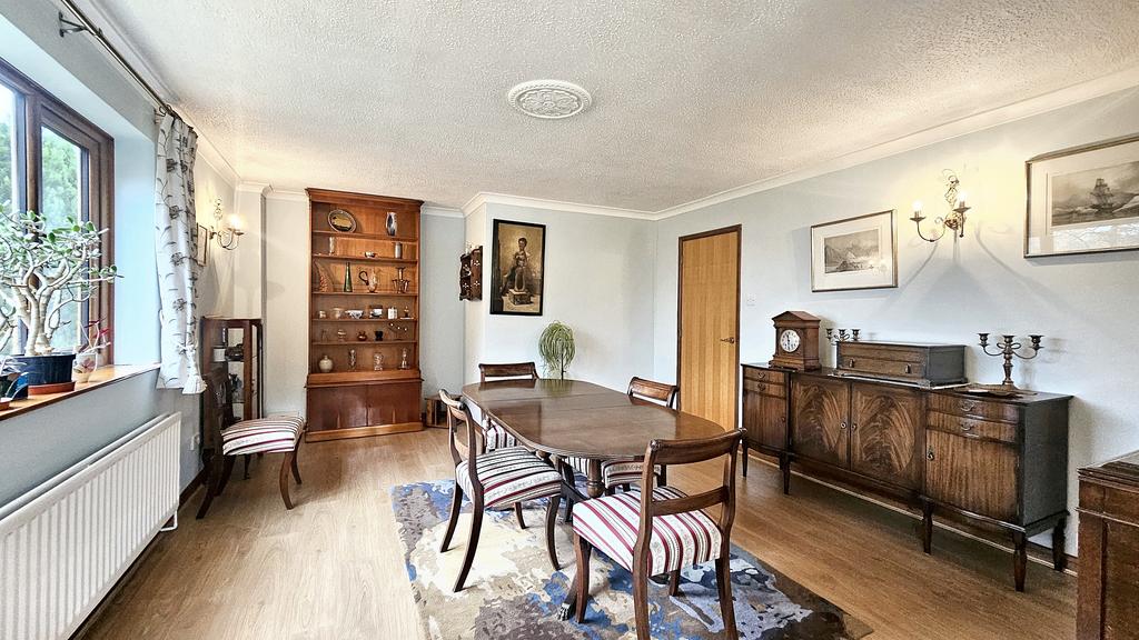 DINING ROOM Approx (5.30m x 4.0m)(17'3'' x 13'1'') with wood effect laminate flooring, ceiling coving, radiator, side window, three wall lights, four power points and glazed double French window to rear gardens.