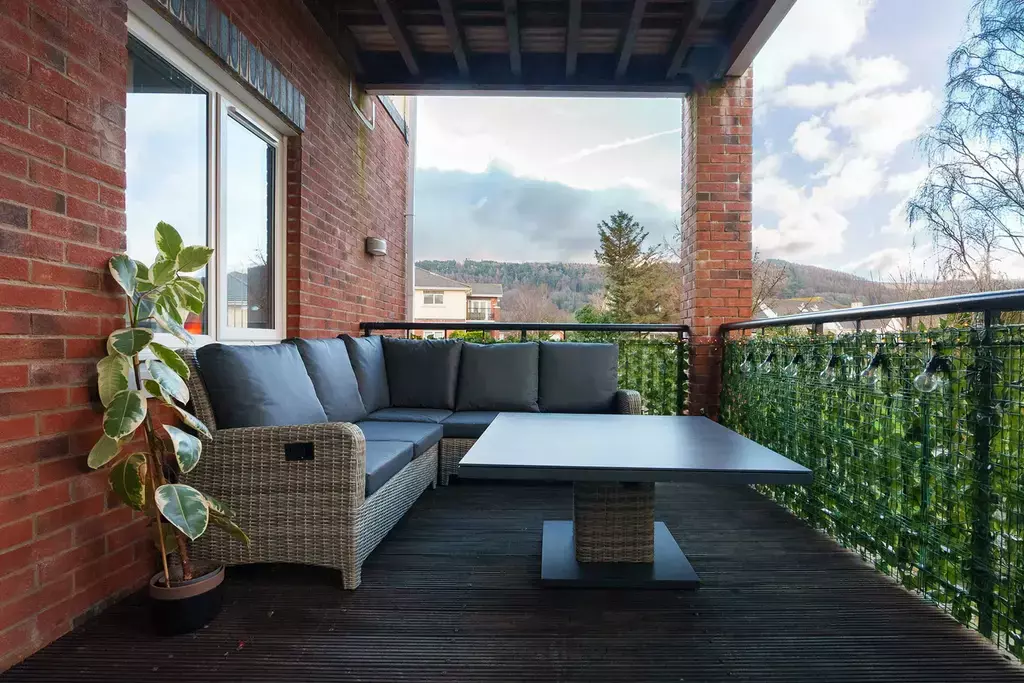 The large living/dining room opens onto a generously sized balcony, perfect for relaxing or entertaining while enjoying the scenic views. A beautifully appointed dining kitchen with granite worktops and integrated appliances adds to the property’s sophistication.