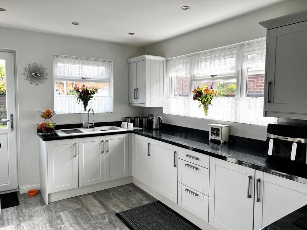 - Light grey suite kitchen with integrated washing machine, two fridges, hob and oven