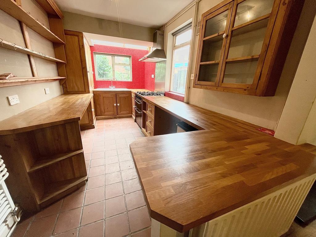 Spacious kitchen with a plentiful range of solid wooden store units, wooden work surfaces, ceramic sink and drainer, electric oven and gas hob with extractor fan over, space for other appliances, rear and side windows, towel radiator.