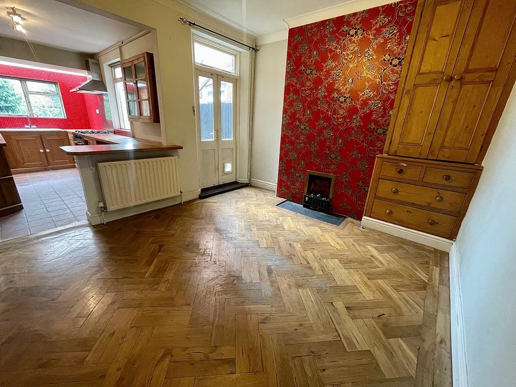 Spacious with attractive wooden flooring, built in store cupboards, French doors to garden, radiator and open plan access into: