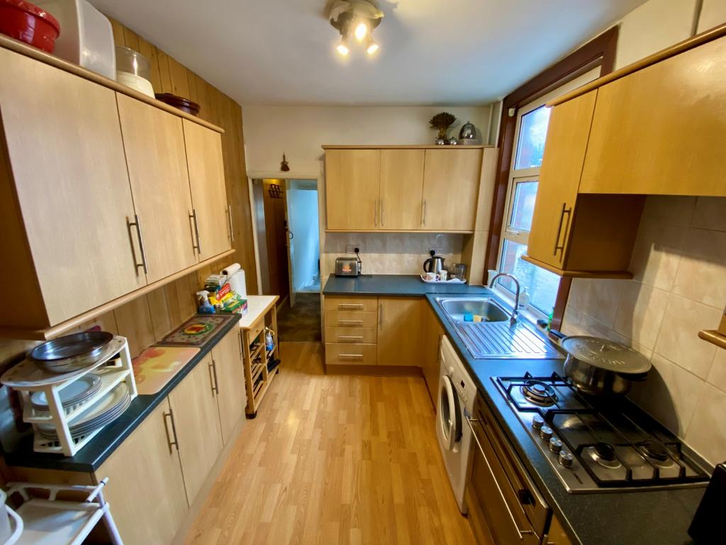 Double glazed window to side elevation. Base and wall mounted units with work surface over. Integrated electric oven, gas hob and fridge. Stainless steel sink unit with work surface.