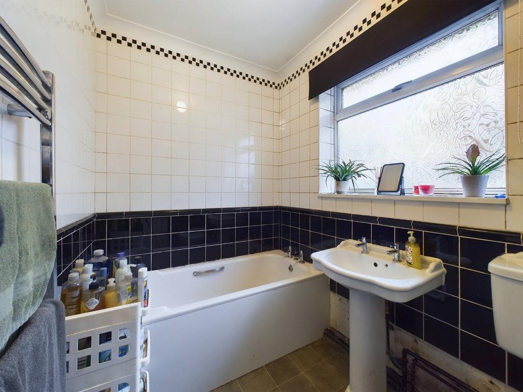 uPVC frosted window to side elevation. Heated towel rail. Suite comprising panelled bath, Porcelain wash hand basin and low level WC.