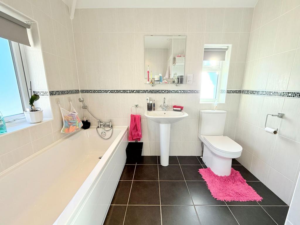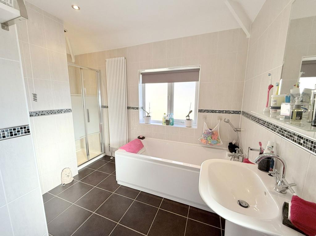Being fitted with a four piece white suite comprising a panelled bath with shower attachment, separate shower enclosure, low flush WC and pedestal wash hand basin. Tiling to full height, tiled flooring, obscure double glazed windows to side and rear, vertical radiator and spot lights to ceiling