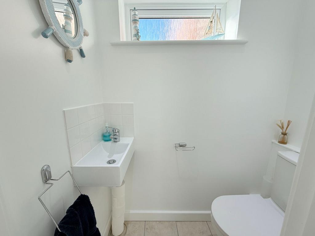 With low flush W.C, wall mounted wash hand basin with tiled splashback, obscure double glazed window to side, tiled flooring, radiator and ceiling spot lights