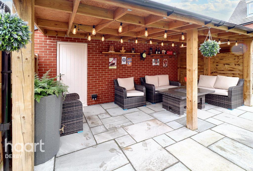 The property is accessed via a widened driveway, thoughtfully extended by the current owners to accommodate parallel parking for multiple vehicles. The detached garage is equipped with power and lighting, along with a mounted electric vehicle charging point for added convenience. Gated access leads to the rear garden, which has been beautifully landscaped to include two alfresco dining areas. One dining space is set beneath a pergola, offering a secluded and private retreat, while the rest of the garden features a neatly maintained lawn, ideal for relaxation or outdoor activities.