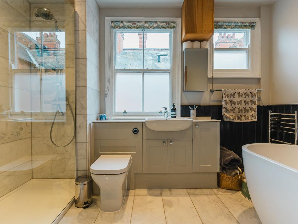 On the first floor, a split-level landing leads to three spacious bedrooms, all served by a stunning four-piece family bathroom. The largest bedroom, situated at the front of the house, features stripped timber flooring, a large sash bay window that fills the room with natural light, and an original cast-iron feature fireplace. The second double bedroom, centrally located, boasts another cast-iron fireplace, an original sash window with leafy views over the rear garden, and stripped timber flooring. The third bedroom, currently configured as a study, is positioned at the far end of the first floor and houses the Worcester combi boiler (approximately six years old).