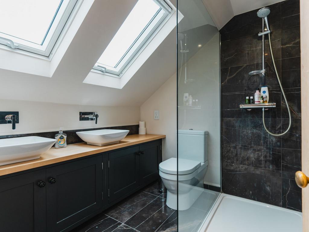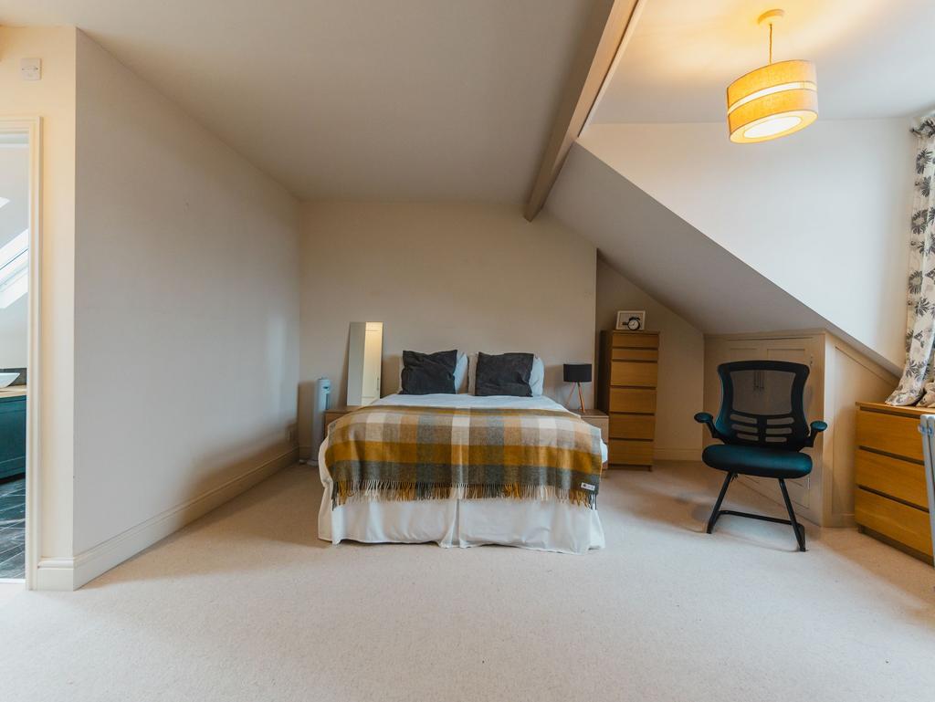 The recently refurbished family bathroom includes a walk-in rainfall shower, a roll-top bath, and a large vanity unit. A staircase leads to the fourth and final double bedroom, which has been cleverly designed as part of a loft conversion. This generously sized room benefits from Velux skylights, allowing an abundance of natural light. It is complemented by a stylish three-piece en-suite and a walk-in dressing area with fitted wardrobes.