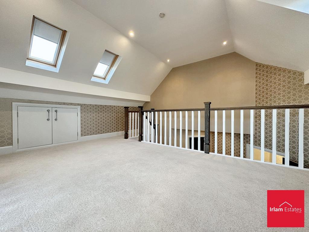 The property also boasts a range of modern amenities for added convenience and comfort, including underfloor heating throughout, a Bose Bluetooth system, Krittle doors, and a boiling water tap. The engineered wood flooring in the hallway and kitchen adds a touch of warmth and sophistication, while the wall mirror and gallery landing enhance the feeling of space and light.