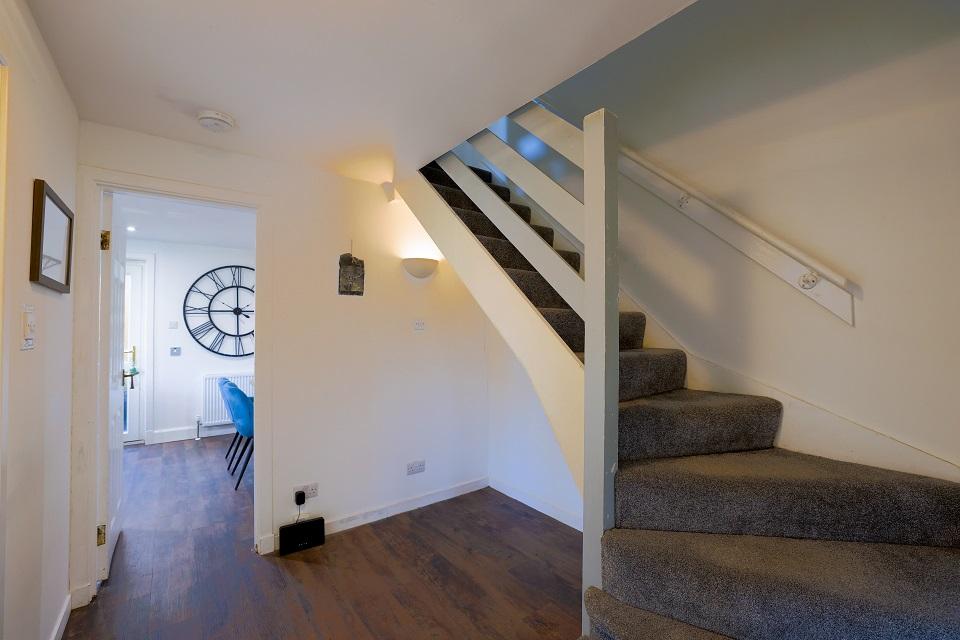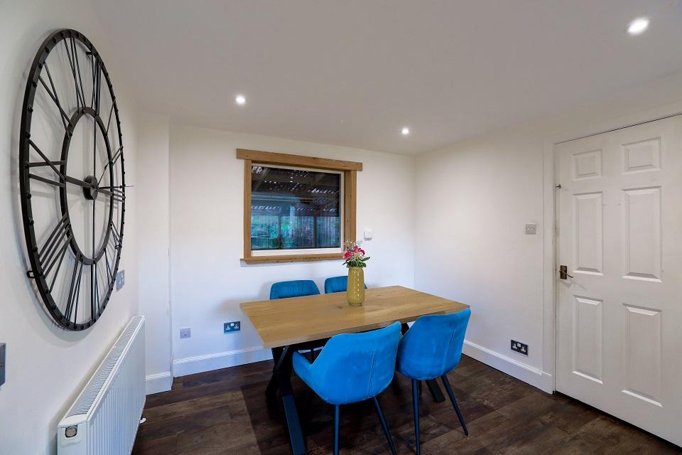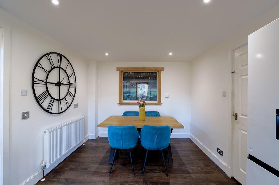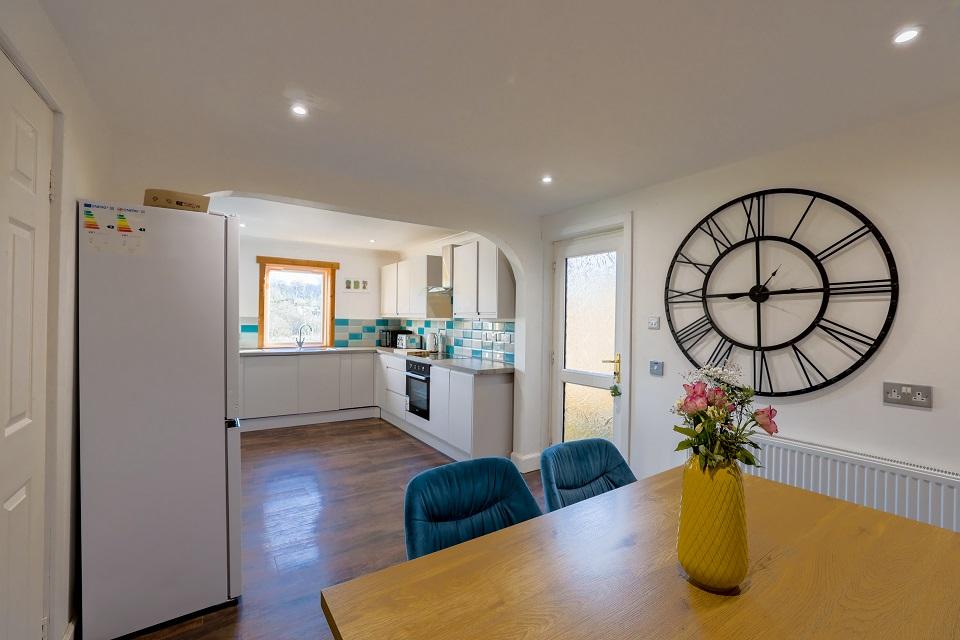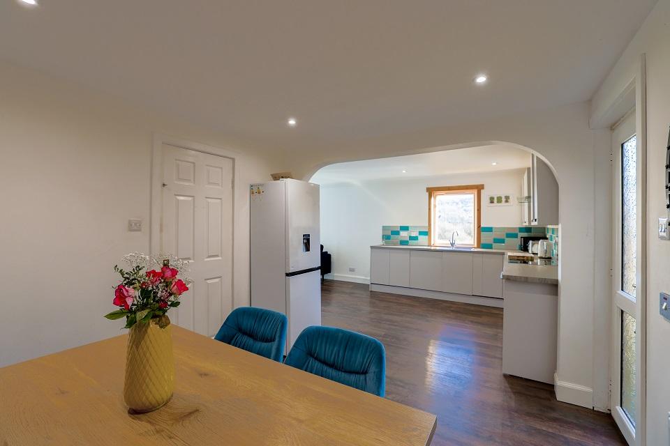 The ground floor accommodation comprises entrance Porch with shelved cupboard, Hallway with stairs rising to the first floor, Shower Room, and modern fitted Kitchen which is open plan to a Dining Area and Lounge (with gas stove).