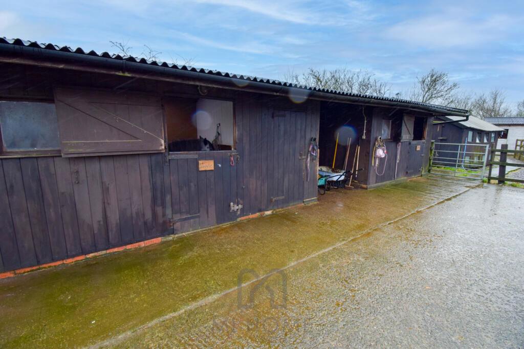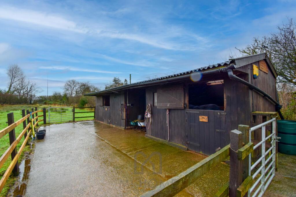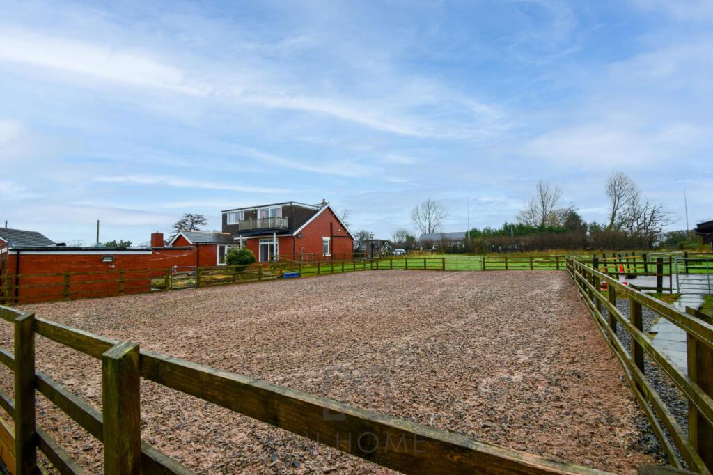 The property is positioned on an acre plot with gated circular driveway, field, horse paddock, stables for three horses, riding arena measuring 16m x 26.5m, horse solarium area, tack room and outdoor storage area.