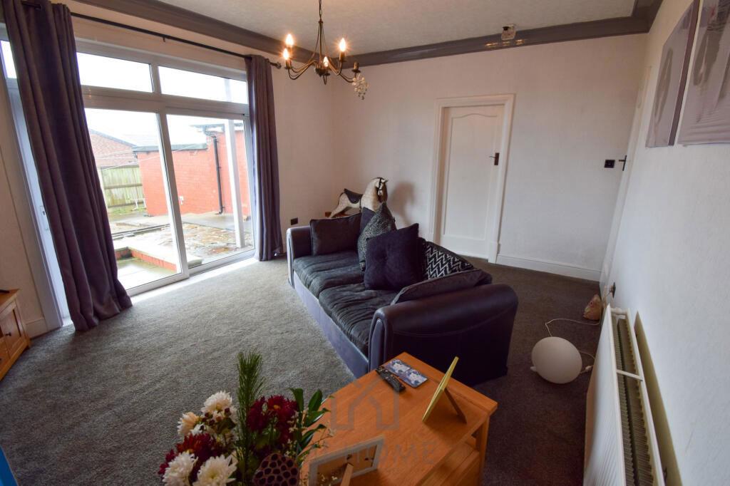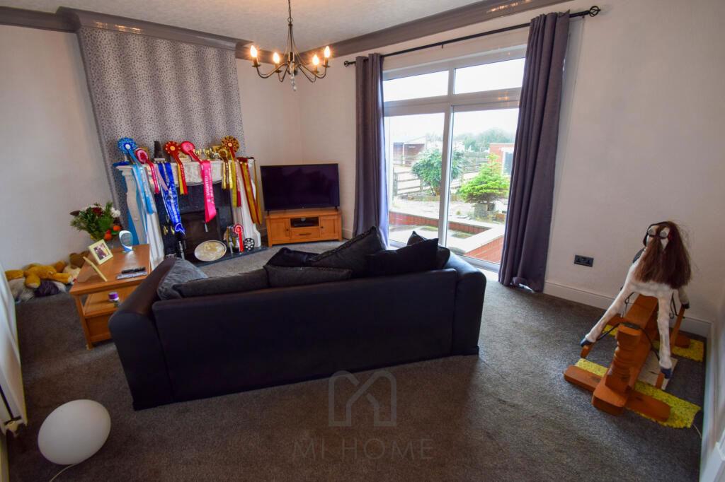 Lounge with sliding patio doors to the rear leading out onto the garden, feature coal fire with surround, radiator and carpeted flooring.