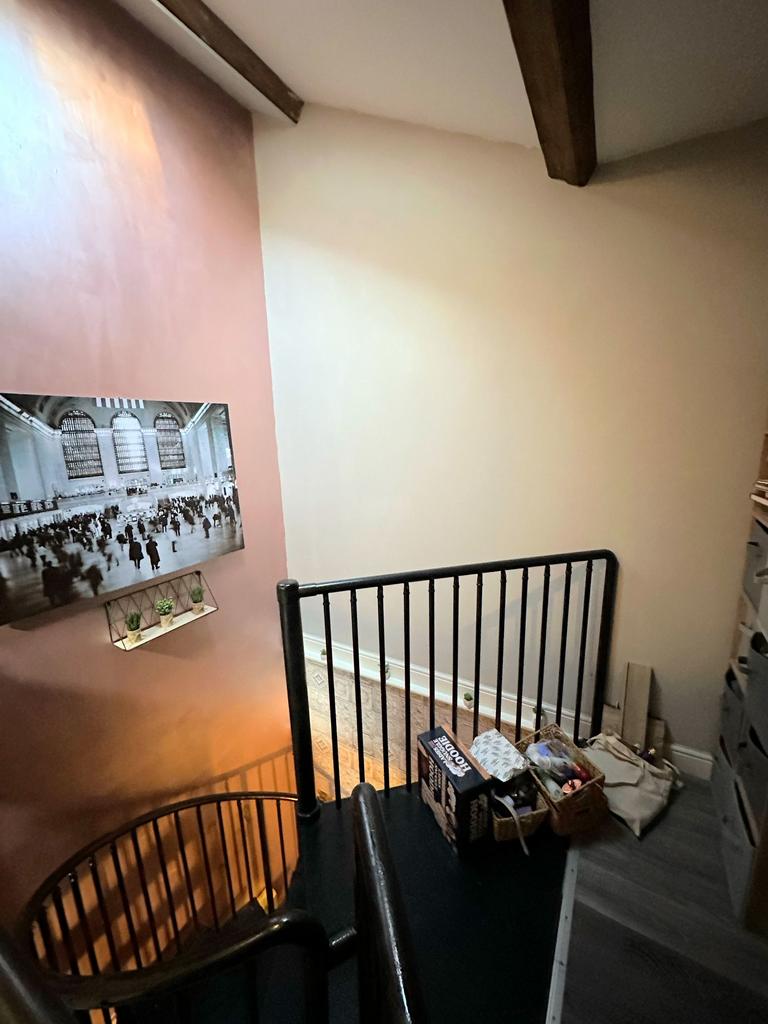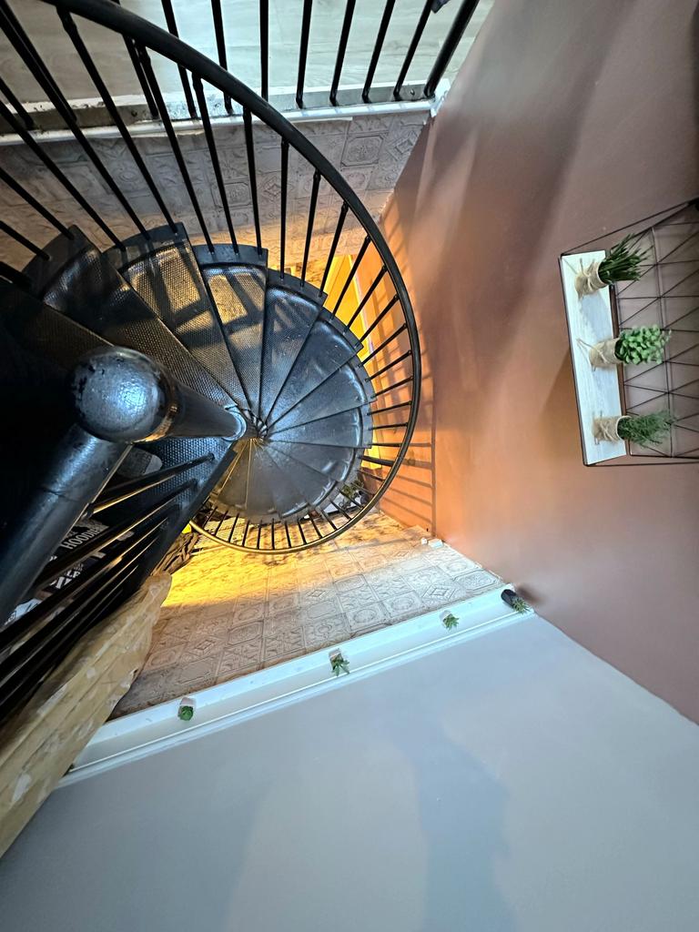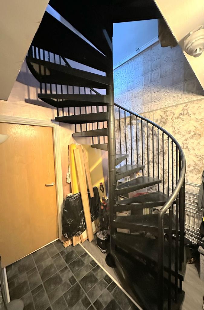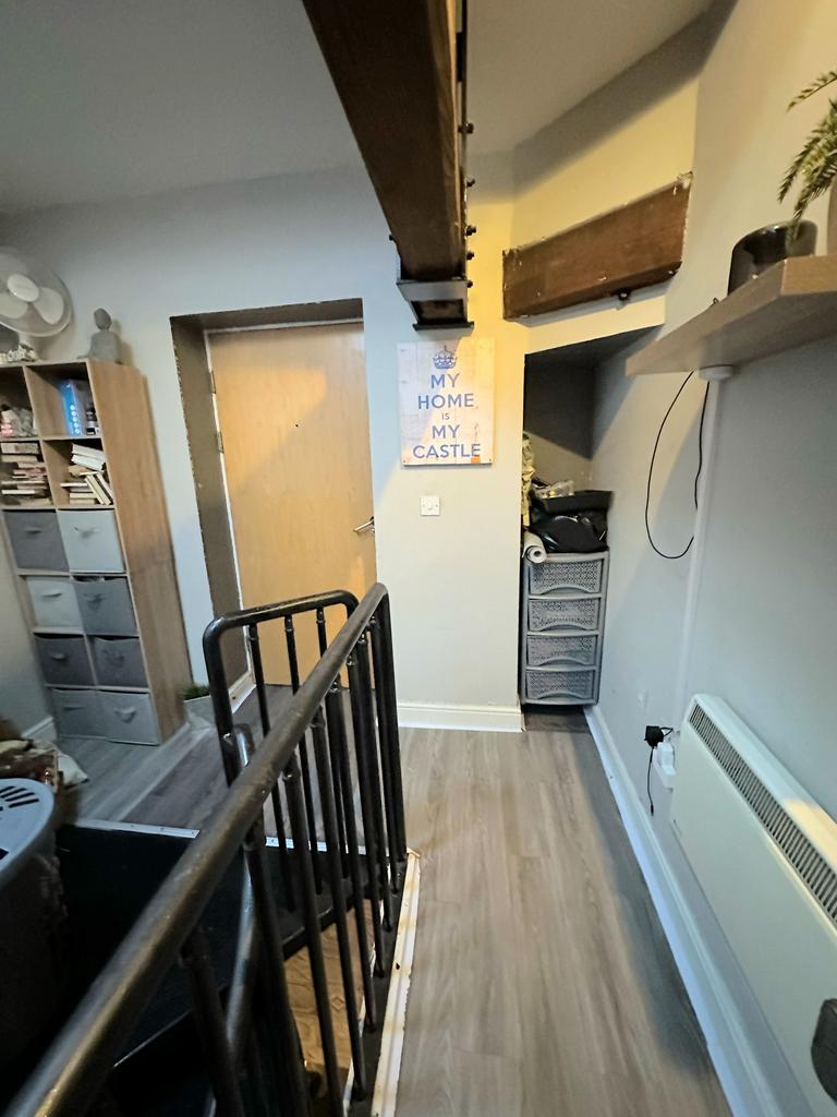 Wooden entrance door to rear, spiral staircase leading to first floor, wall mounted electric heater, wooden doors to downstairs cloakroom, lounge & storage cupboard housing hot water cylinder