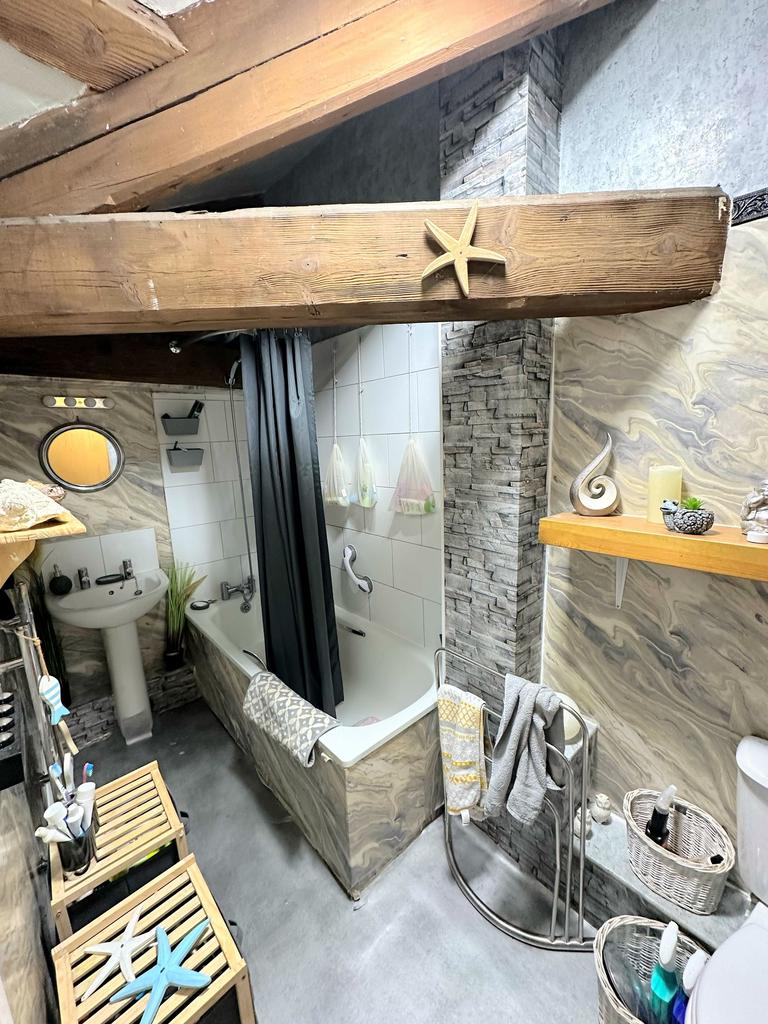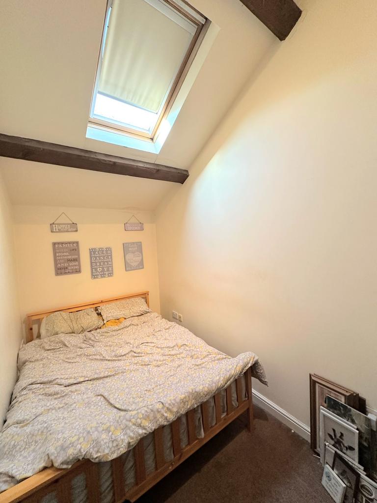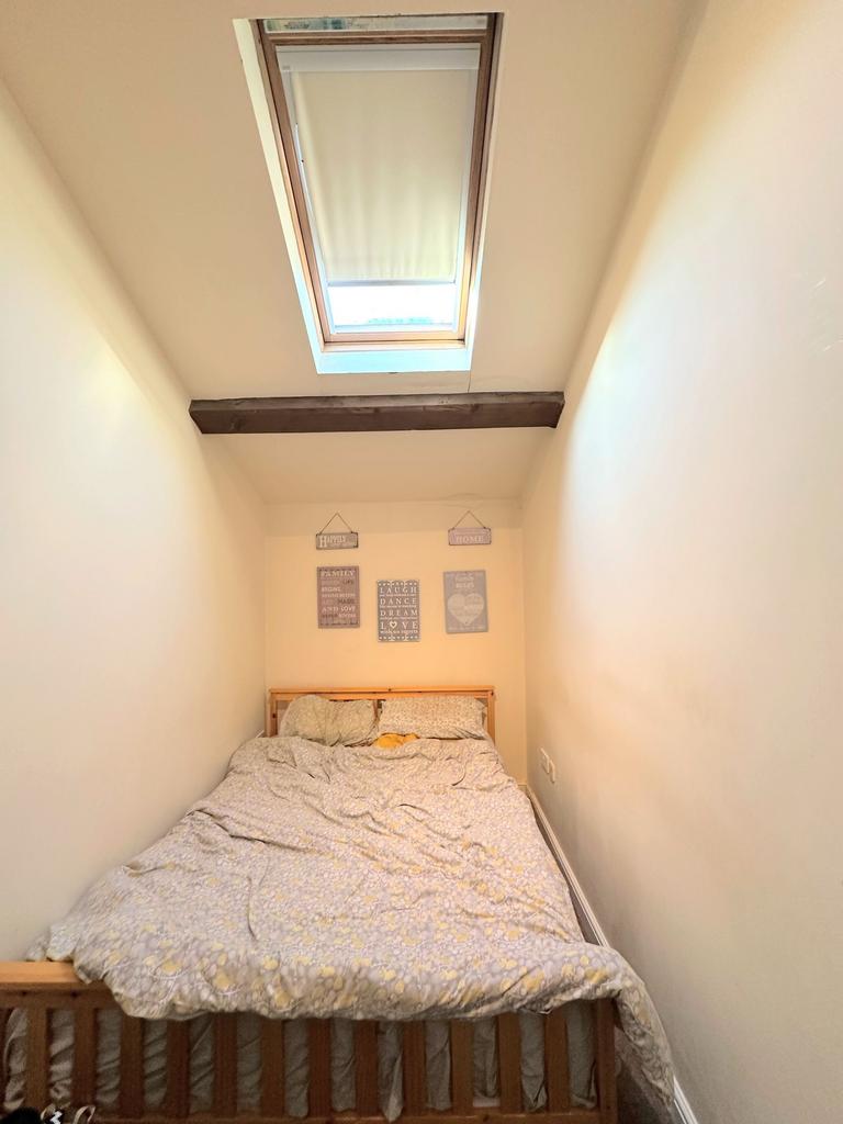 Wooden entrance door to rear, exposed wooden beams to ceiling, velux window to rear, laminate floor, wooden doors to bedrooms & bathroom