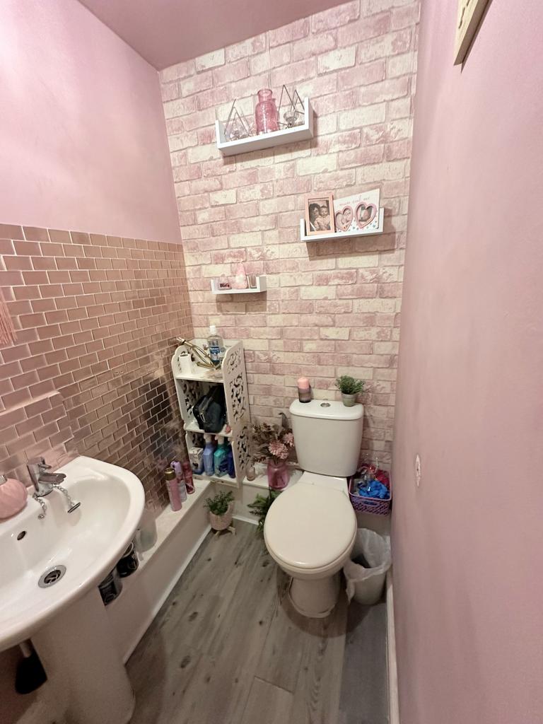 Low level WC, pedestal wash hand basin with chrome taps, ceiling mounted extractor fan, laminate floor