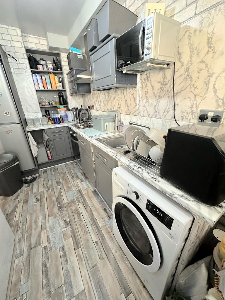Range of kitchen wall & base units with work surface over, stainless steel sink & drainer with chrome mixer tap, stainless steel electric hob with extractor hood over, plumbing for automatic washing machine, integrated dishwasher, space for fridge/freezer