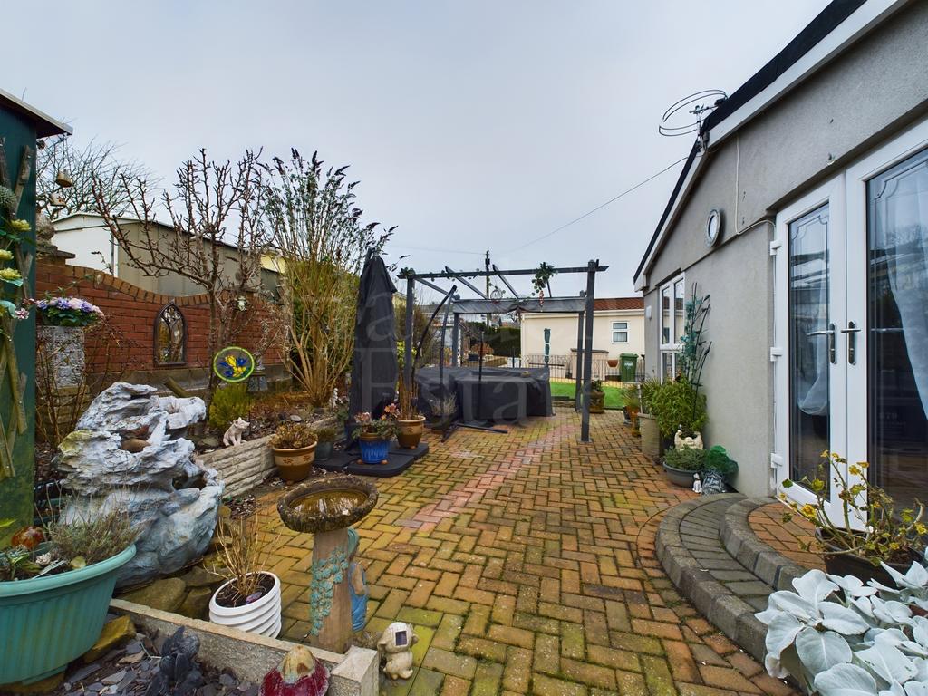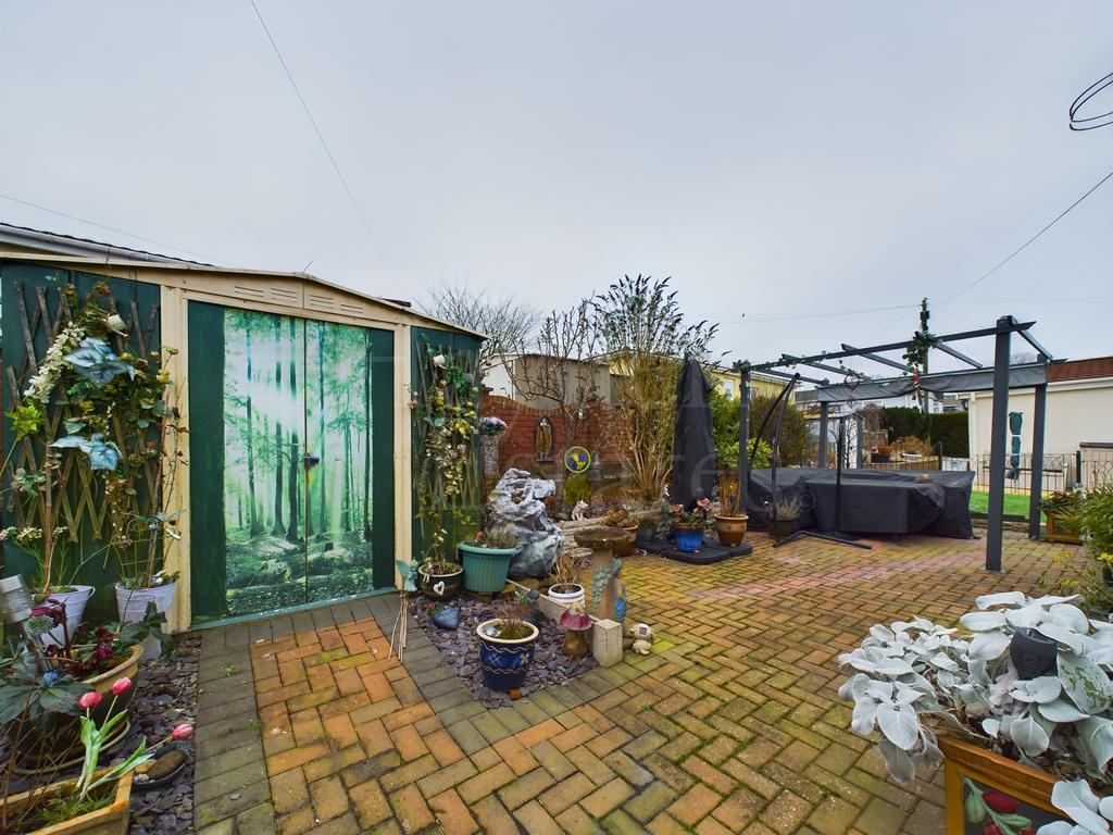 Block paved seating areas. Raised beds and faux grassed area. To the front is a rockery area. A metal shed is to be included in the sale. There is access all around the property.