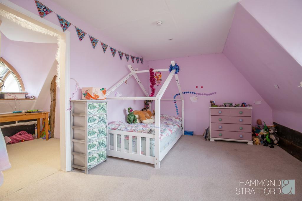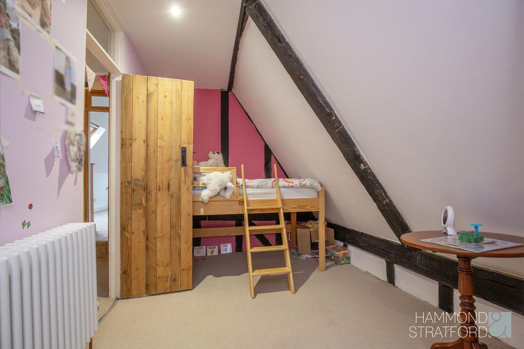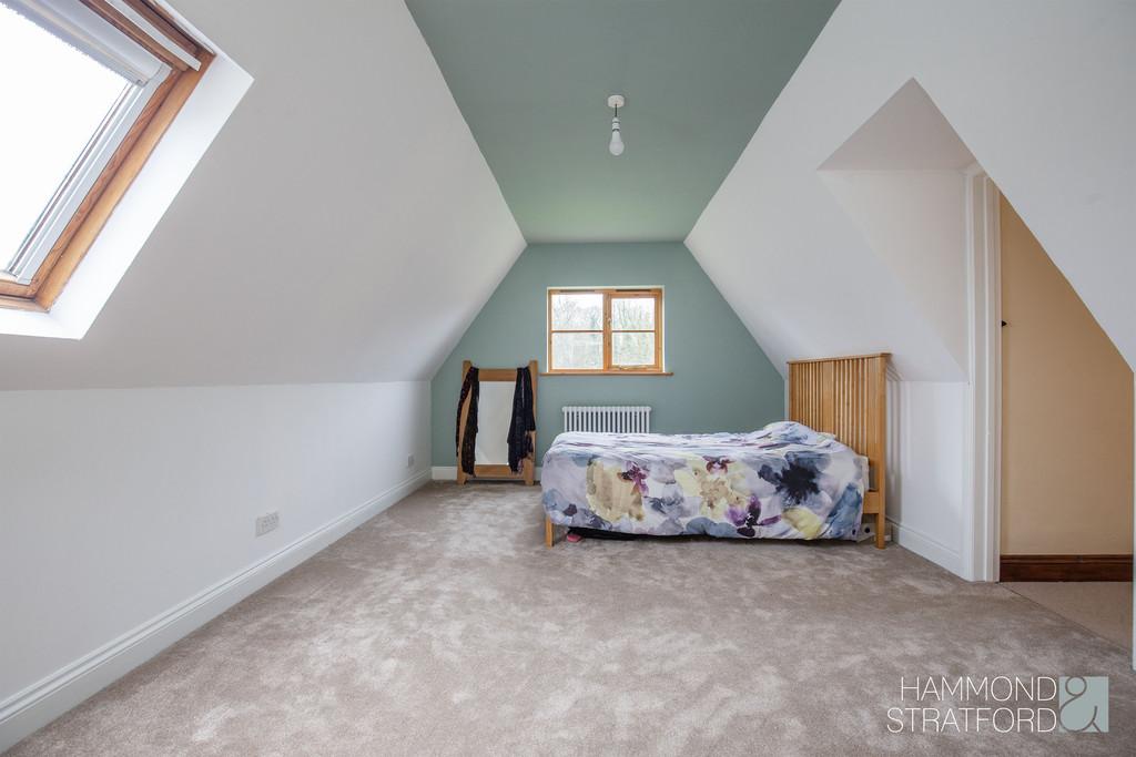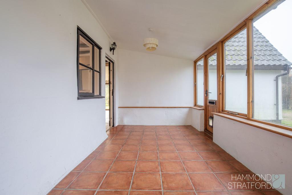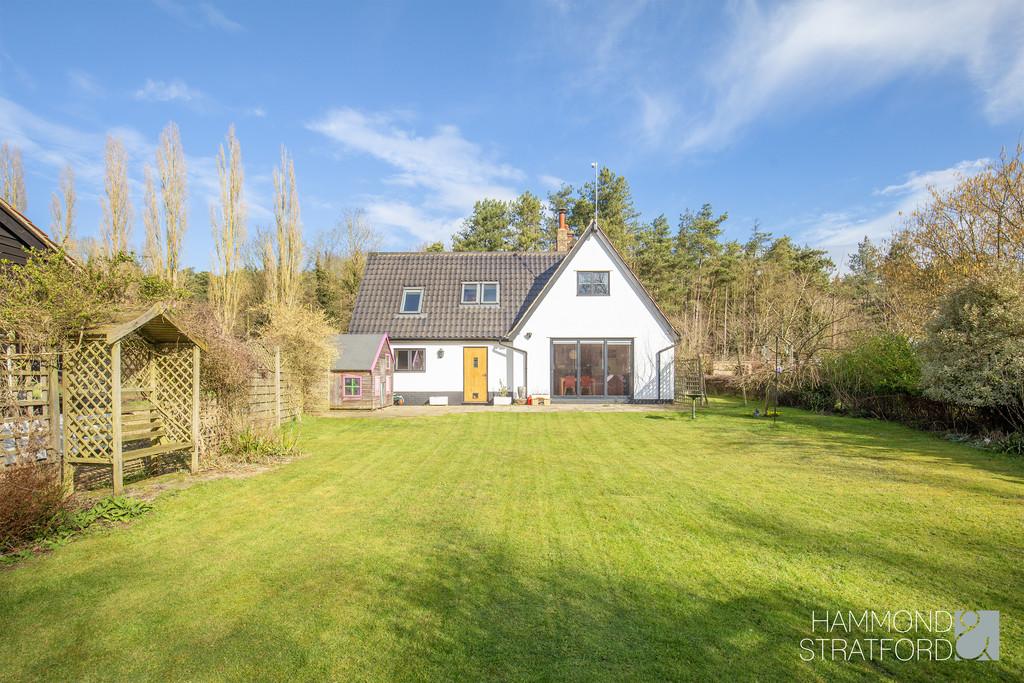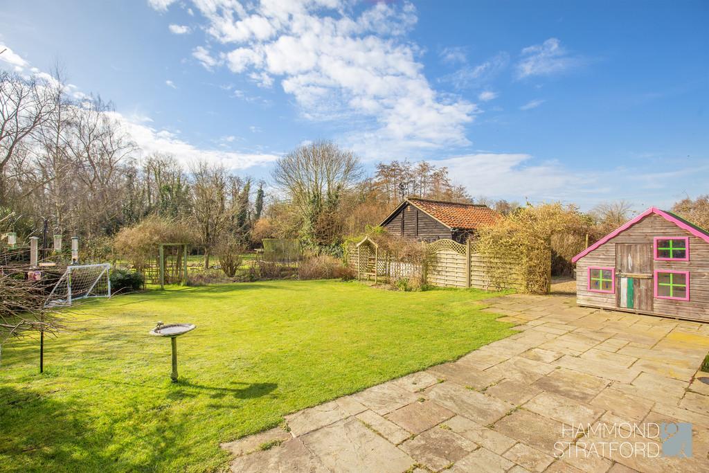 OUTSIDE The property is approached via a driveway that leads off a village lane, providing access to both the main house and a detached double garage. The driveway provides off-road parking for multiple vehicles, while the garage with barn-style doors includes light, power and solar panels on the roof, enhancing the property's eco-friendly credentials. The part-thatched property is bordered by hedging and the oil tank is discreetly positioned to the left of the house. The rear garden is a standout feature, extending across an expansive south-facing plot of approx. 0.36 acres. This tranquil space is predominantly lawned, interspersed with mature trees and shrubs, making it perfect for outdoor activities and family gatherings. The property's eco-conscious features extend to a shared bio-treatment plant, located in the driveway, which ensures environmentally friendly drainage. Its location within a conservation area further underscores the home's harmonious relationship with its surroundings, while the proximity to the River Chet at the rear enhances the picturesque charm of the plot. This unique combination of natural beauty, historical character and modern convenience makes the outdoor space a true highlight of the property.
