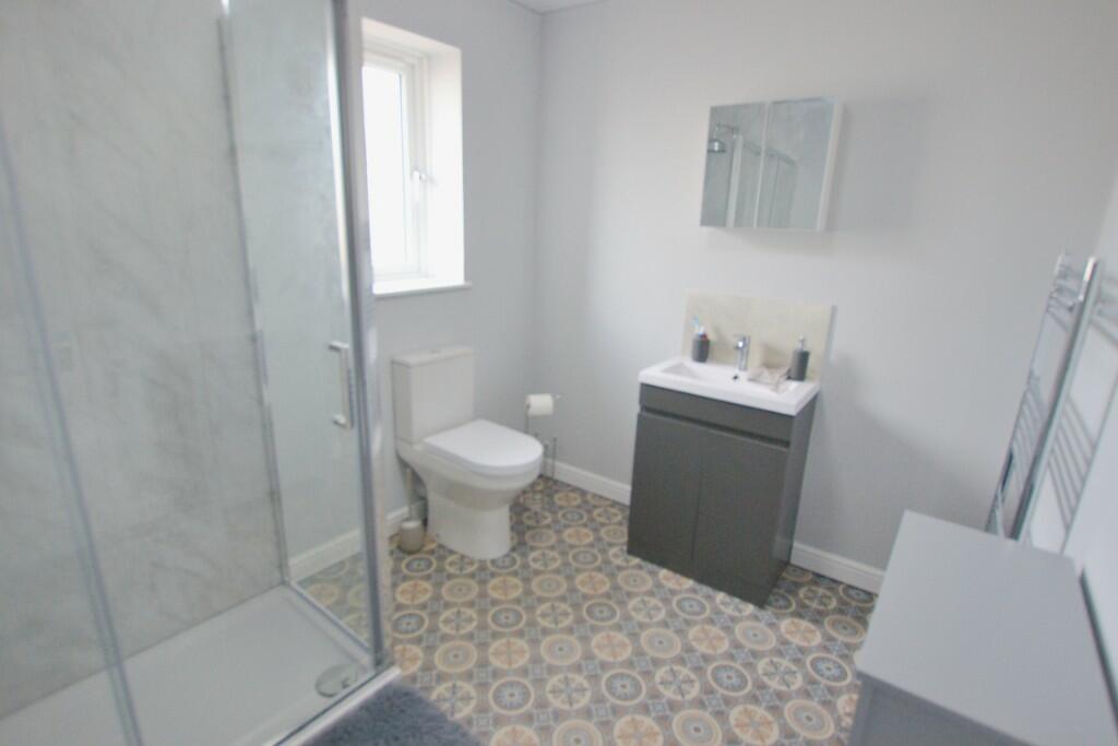 Double glazed window, feature towel rail radiator, low level WC, wash hand basin in storage unit, double shower cubicle, part cladded walls, vinyl flooring. (Room Size: 2.67m x 2.19m)