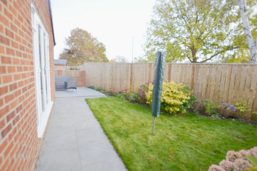 Enclosed rear garden with lawned area, patio area, side gated access, newly installed fence.