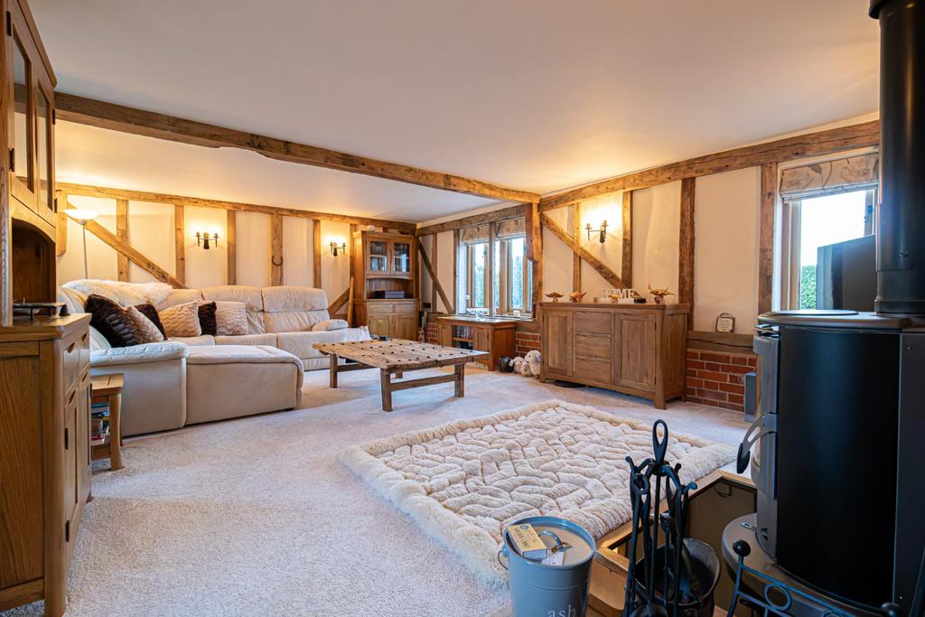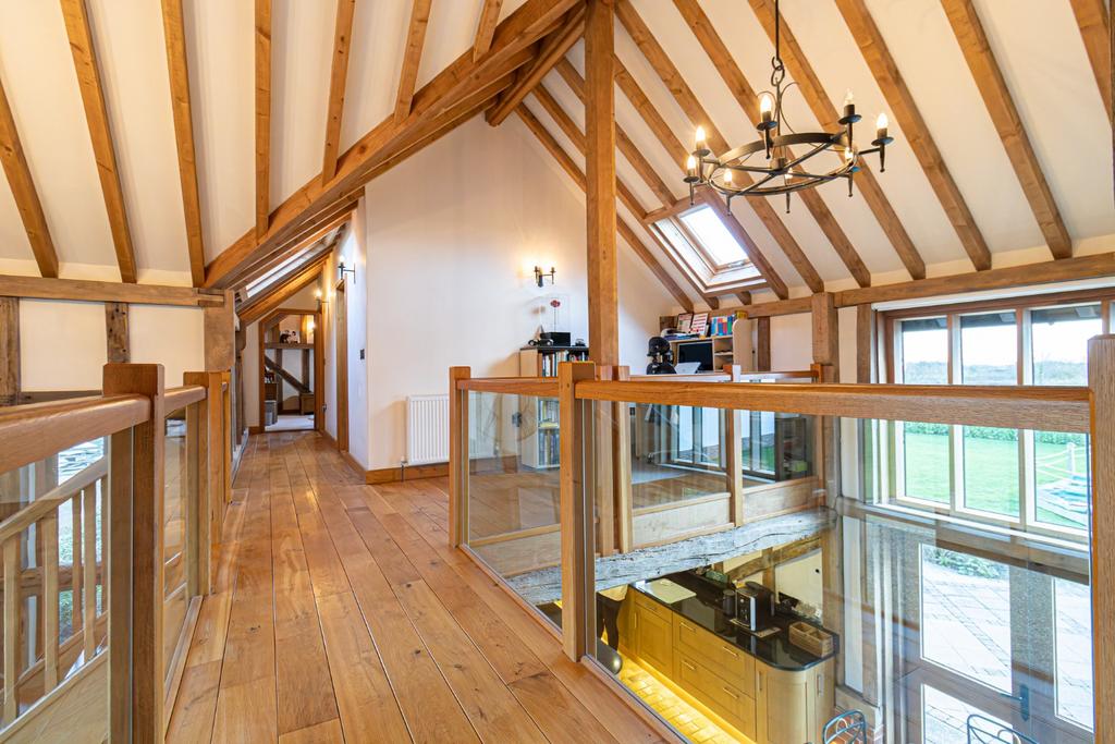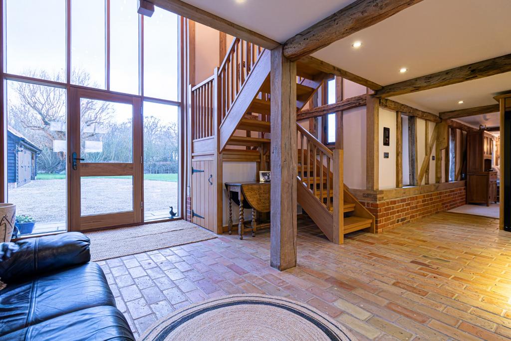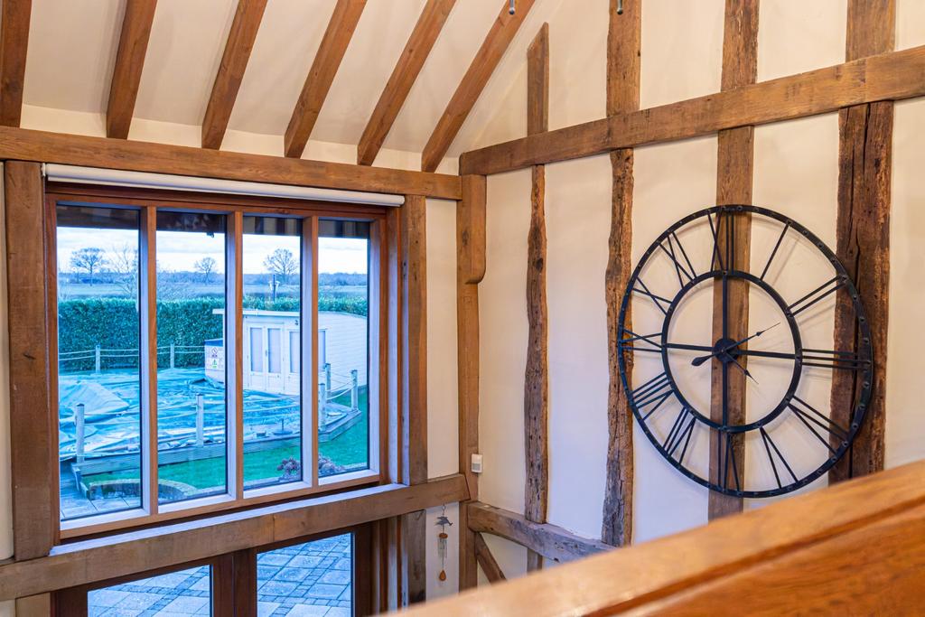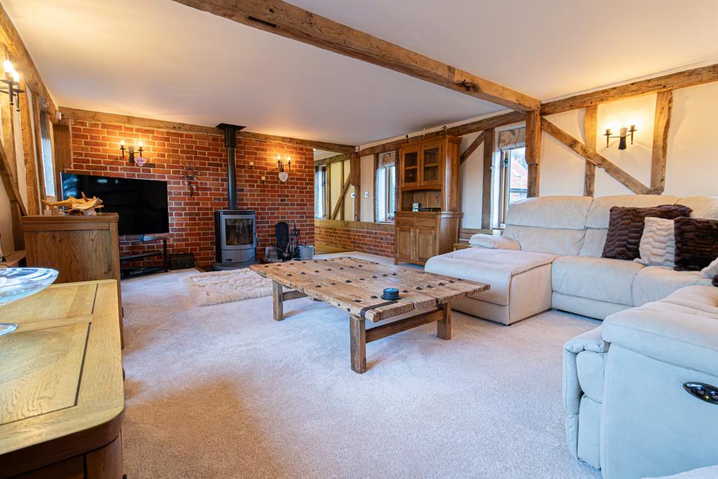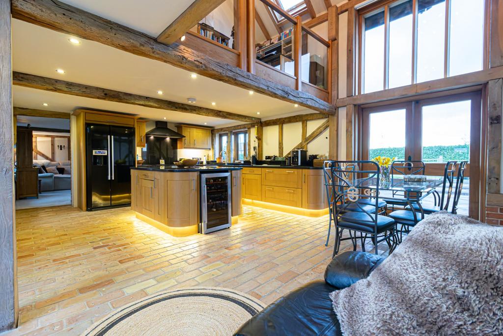 Visitors are welcomed into the property via the impressive entrance hall which features 2-storey vaulted ceilings along with full-height glazing on the front and rear walls, which floods the room with natural light. This then opens up into the beautiful open-plan kitchen/diner, which is adorned with brick flooring along with beamed ceilings and walls, situated in the heart of the home to create a fantastic place to entertain family and friends. From the dining area glazed doors with double height glazed panels above give access to the south facing gardens. The bespoke kitchen is fitted with a range of attractive storage units under granite worktops, which incorporate a Belfast sink, a free-standing range cooker with extractor hood over and an American-style fridge freezer. There are also several integrated appliances that include a dishwasher, microwave and wine cooler. Neighbouring the kitchen is a useful utility room, which is again fitted with a range of storage units along with a single bowl ceramic sink and plumbing/space for a washing machine and tumble dryer. From the utility is access to a cloakroom WC and airing cupboard and through to the double garage with loft space above. Leading off the kitchen/diner on the opposite side of the property is the inviting living room, which again features attractive beamed ceilings and walls and enjoys a double aspect that looks out onto the surrounding gardens. The main focal point of the room, however, is the charming log burner, which adds a cosy feel to the space.