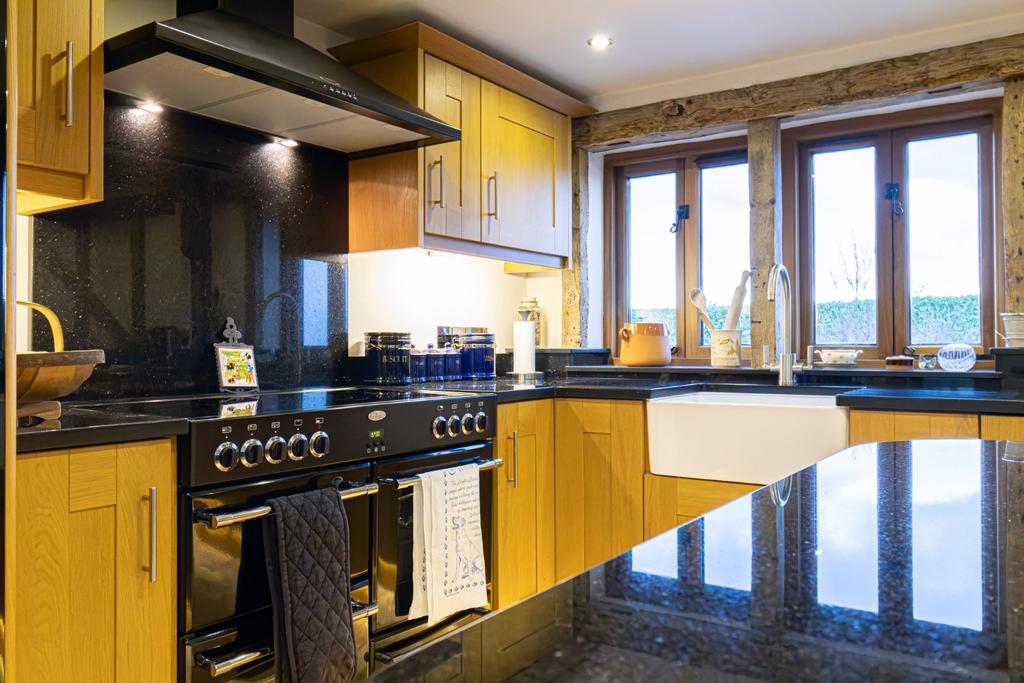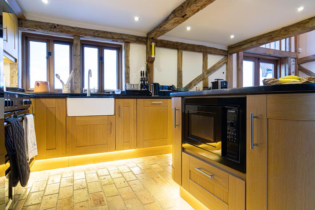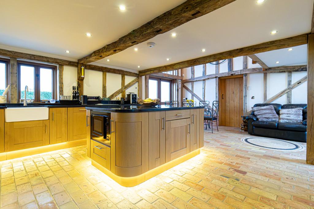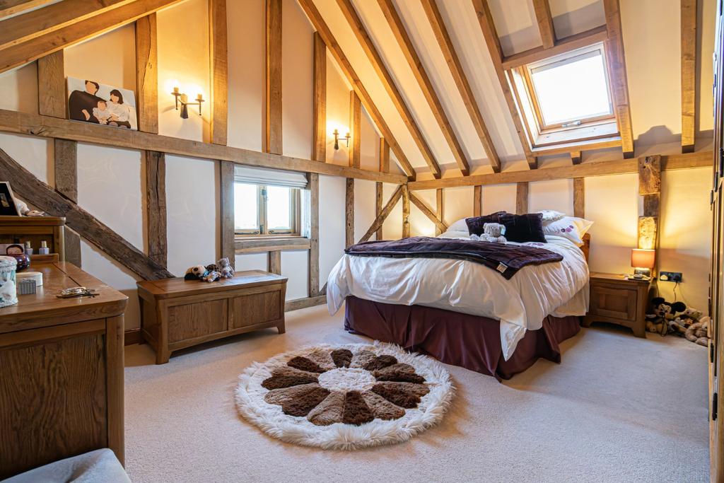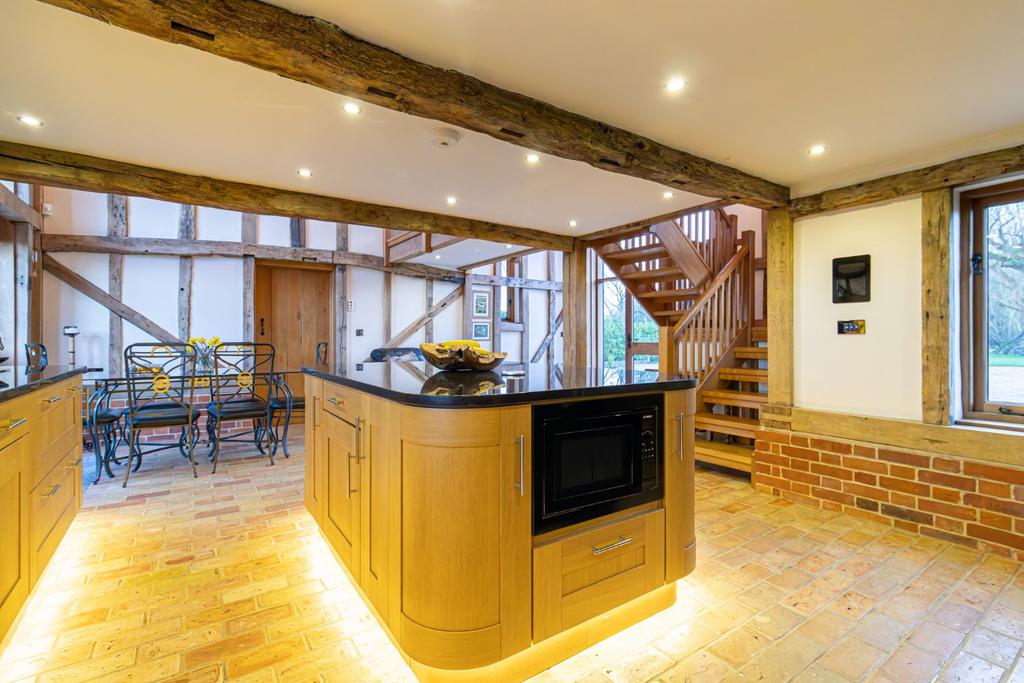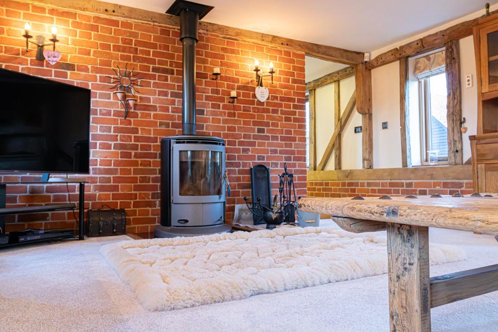 Visitors are welcomed into the property via the impressive entrance hall which features 2-storey vaulted ceilings along with full-height glazing on the front and rear walls, which floods the room with natural light. This then opens up into the beautiful open-plan kitchen/diner, which is adorned with brick flooring along with beamed ceilings and walls, situated in the heart of the home to create a fantastic place to entertain family and friends. From the dining area glazed doors with double height glazed panels above give access to the south facing gardens. The bespoke kitchen is fitted with a range of attractive storage units under granite worktops, which incorporate a Belfast sink, a free-standing range cooker with extractor hood over and an American-style fridge freezer. There are also several integrated appliances that include a dishwasher, microwave and wine cooler. Neighbouring the kitchen is a useful utility room, which is again fitted with a range of storage units along with a single bowl ceramic sink and plumbing/space for a washing machine and tumble dryer. From the utility is access to a cloakroom WC and airing cupboard and through to the double garage with loft space above. Leading off the kitchen/diner on the opposite side of the property is the inviting living room, which again features attractive beamed ceilings and walls and enjoys a double aspect that looks out onto the surrounding gardens. The main focal point of the room, however, is the charming log burner, which adds a cosy feel to the space.
