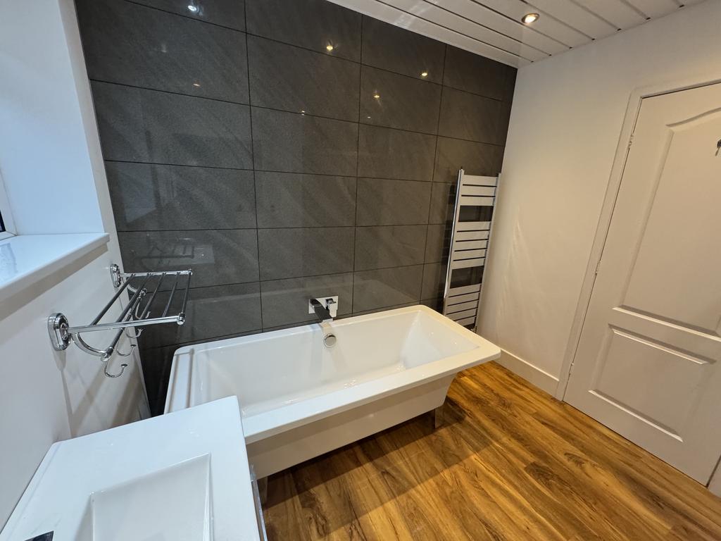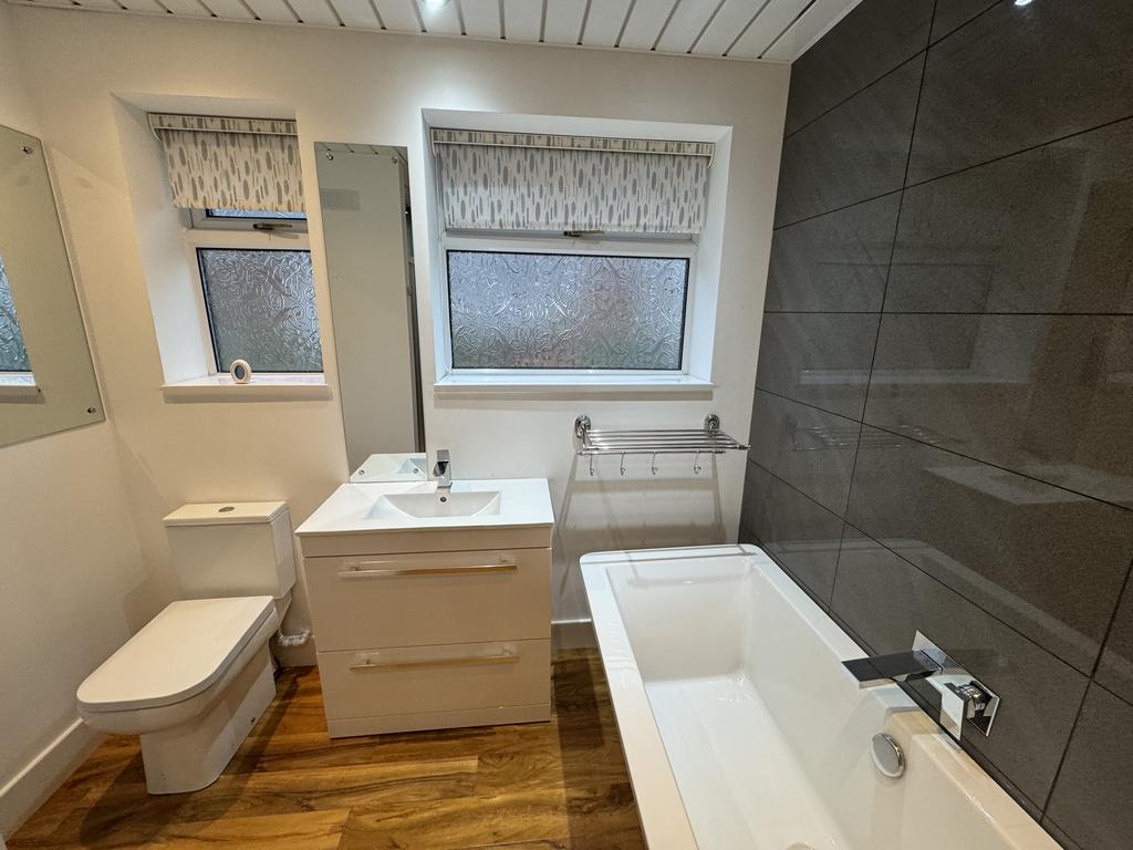 Bathroom. 2 x UPVC Double glazed windows to side heated towel rail, bath, double walk in shower cubicle, WC, wash hand basin set in vanity unit.