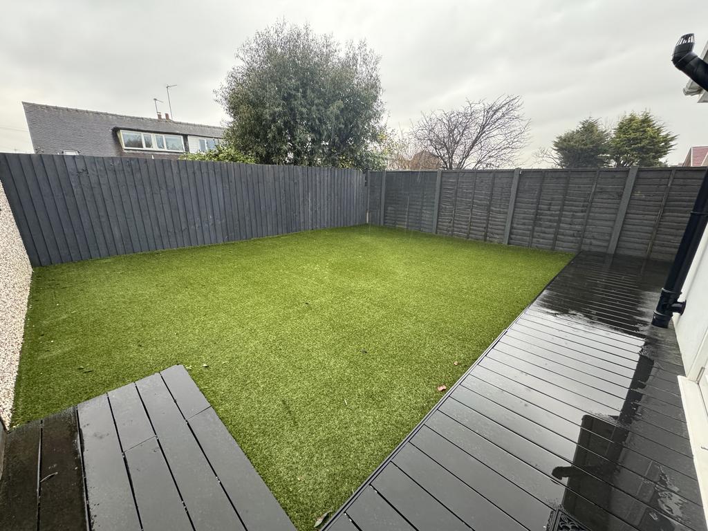 Driveway to front and side offering ample vehicle parking, raised borders and artificial lawn area.