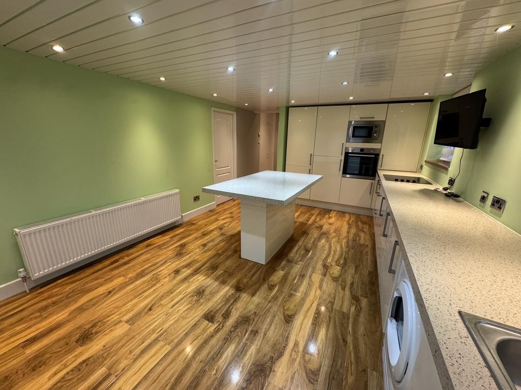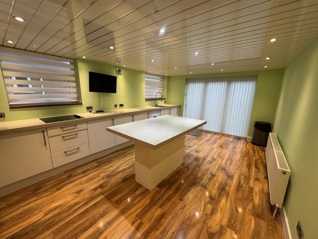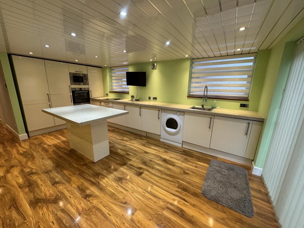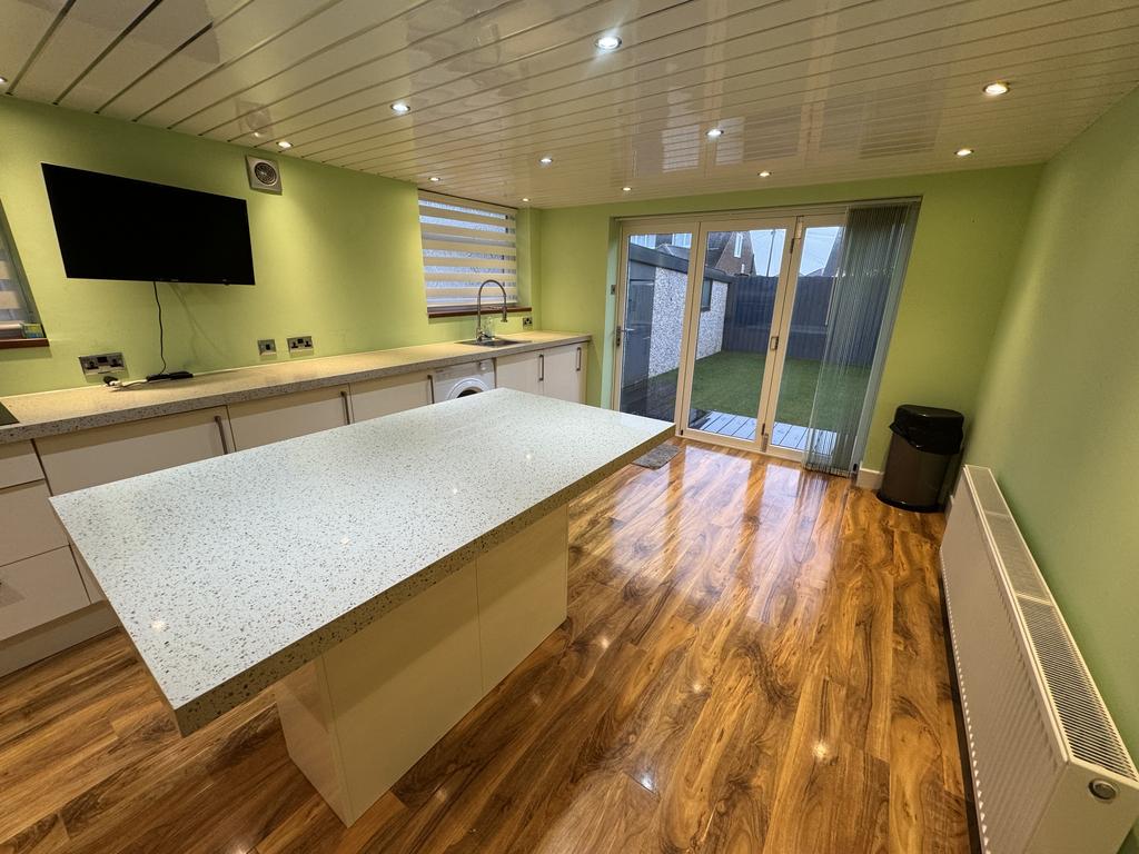 Dining Kitchen. 4.86m x 3.64m, UPVC Double glazed bi-folding doors to rear, UPVC double glazed windows to side, gas central heated radiator, range of modern wall and base units complementary central island, mid level electric oven and microwave, electric hob, sink unit, plumbing for washing machine.