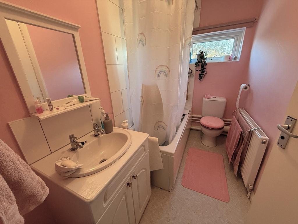 3 piece suite in white comprising of panelled bath having a mains shower over, vanity sink unit and low level w.c. Part tiled walls, radiator and built in cupboard.