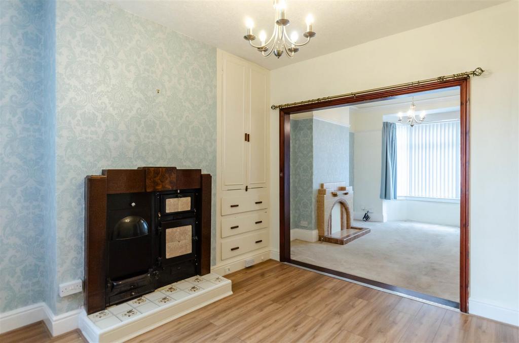 Dining Room - 3.6m x 3.4m (11'9" x 11'1") - Second reception room with a traditional cast iron stove with built in cupboard to the alcove, uPVC rear window, ceiling light, central heating radiator and access to the under stairs storage cupboard.