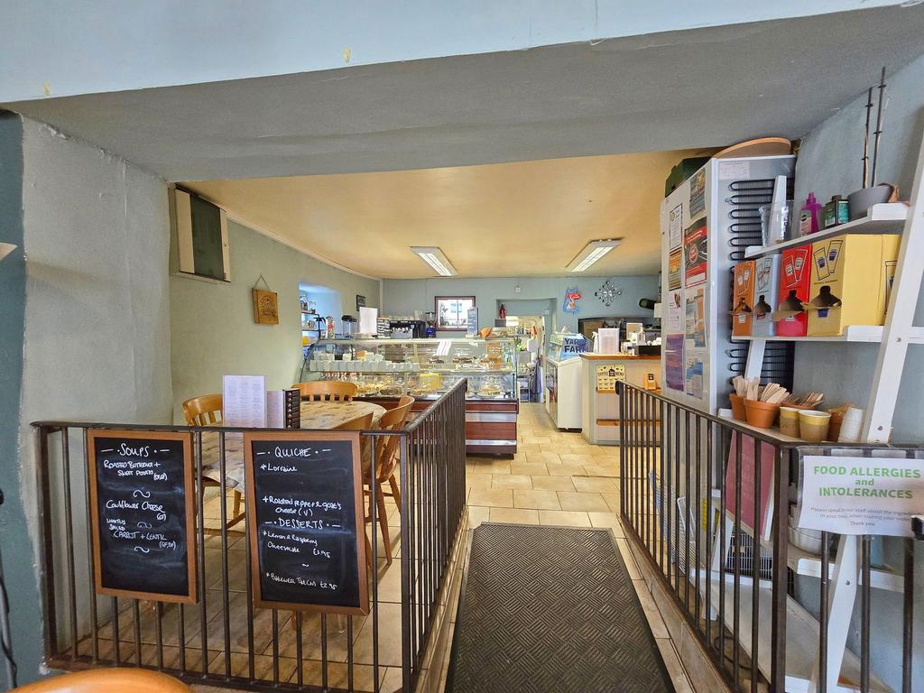 The café is located directly on the main route through town - several steps lead into the main lower section of the café where the majority of the tables are located - a light and bright space illuminated by the two large recently replaced windows to the front of the building. The café has a working log burner located to the side of the main dining area, creating a cosy space for customers in the chillier months.