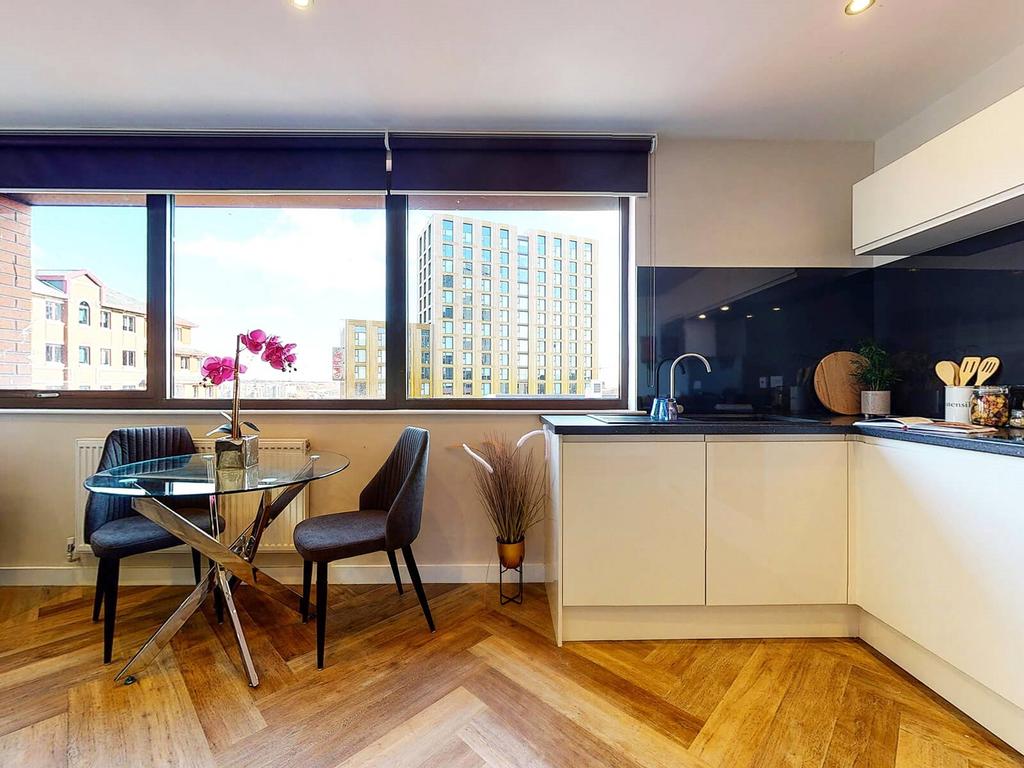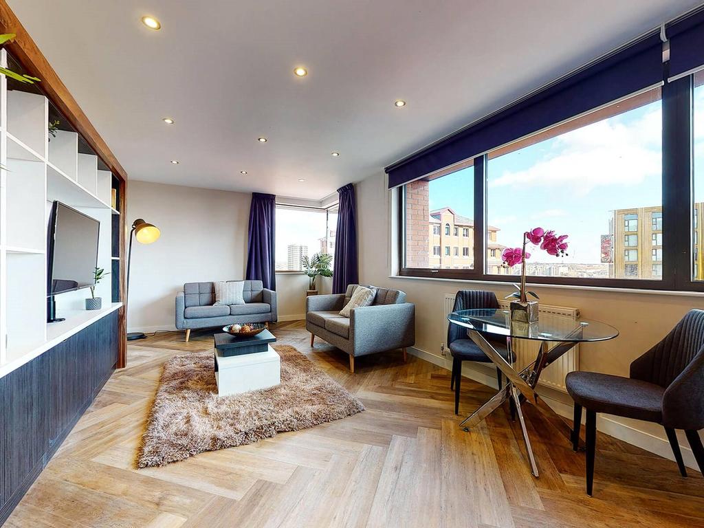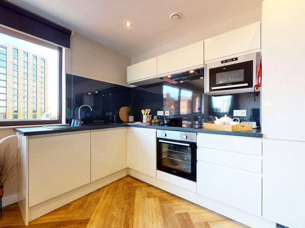 The open plan kitchen is fitted with high-spec appliances including an oven and hob, washer-dryer, integrated fridge/freezer, and a microwave. There is a dining table and chairs within the apartment - perfect for dining with friends. The living area offers comfort and convenience, with a two-seater sofa, coffee table, shelving and a smart TV.