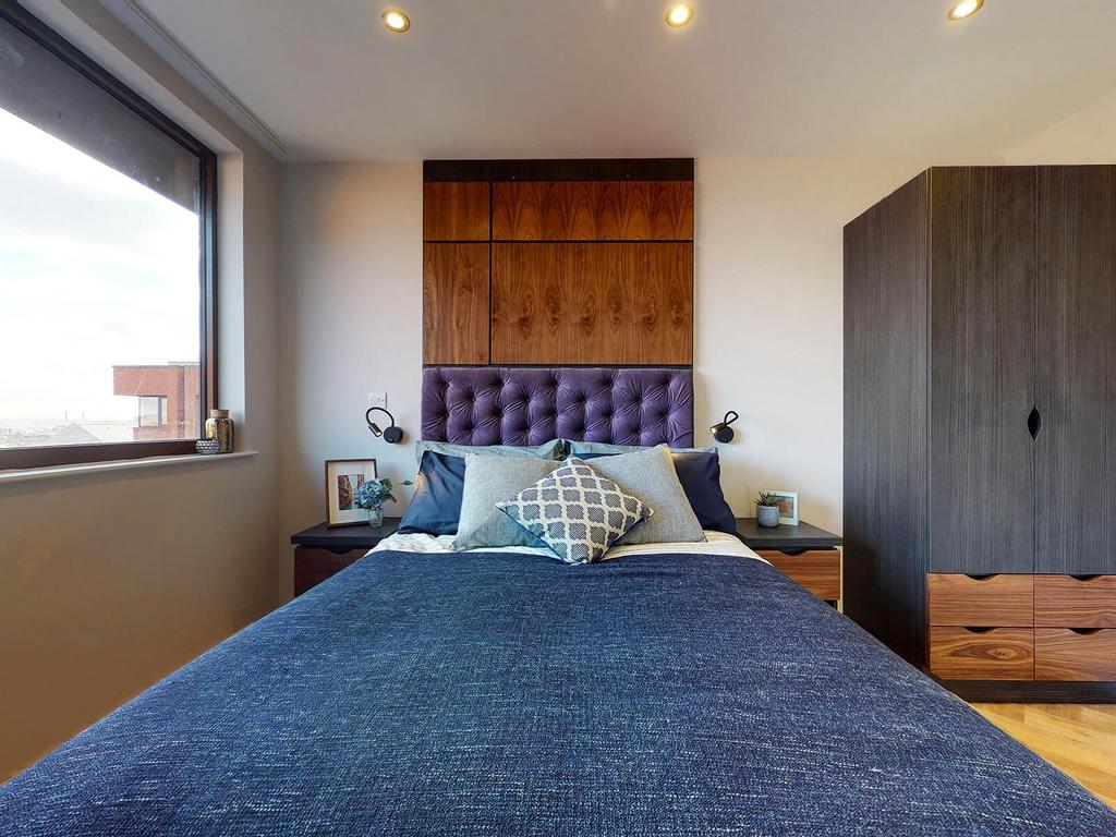 Each bedroom includes a large bed with underbed storage, bedside table, spacious wardrobe and study area with a desk and chair - ideal for working from home or studying in peace.