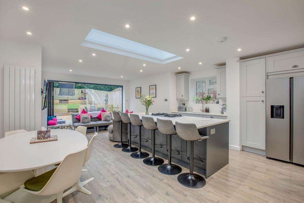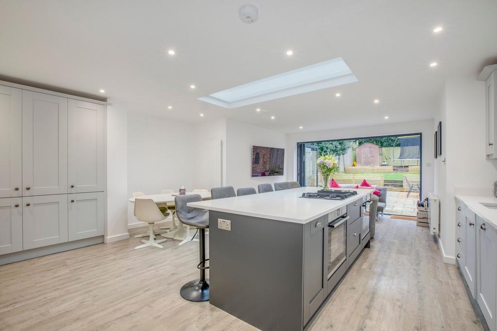 Fitted with a range of eye and base level units incorporating sink unit with mixer tap, two built in ovens, fitted five ring gas hob, built in Indesit dishwasher, space for American style fridge/freezer, central island with seating for four/five people, three radiators, down lighters, window to side, bi folding doors to garden