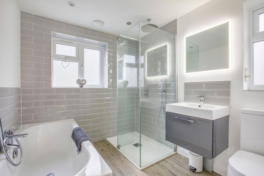 White suite comprising panelled bath with mixer tap and shower attachment, shower cubicle housing rainfall shower, low level W.C., wash hand basin with mixer tap, tiled splash back and cupboards under, heated towel rail, down lighters, part tiled walls, fitted mirror, windows to rear and side