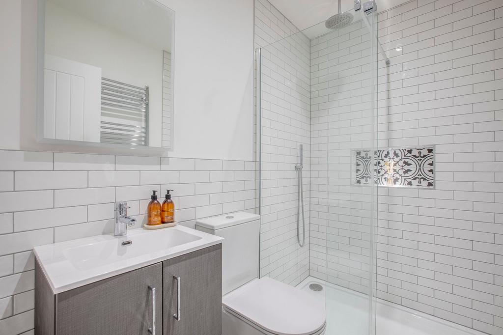 Shower cubicle housing housing fitted rainfall shower, low level W.C., wash hand basin with mixer tap and cupboards under, heated towel rail, part tiled walls, tiled flooring, down lighters